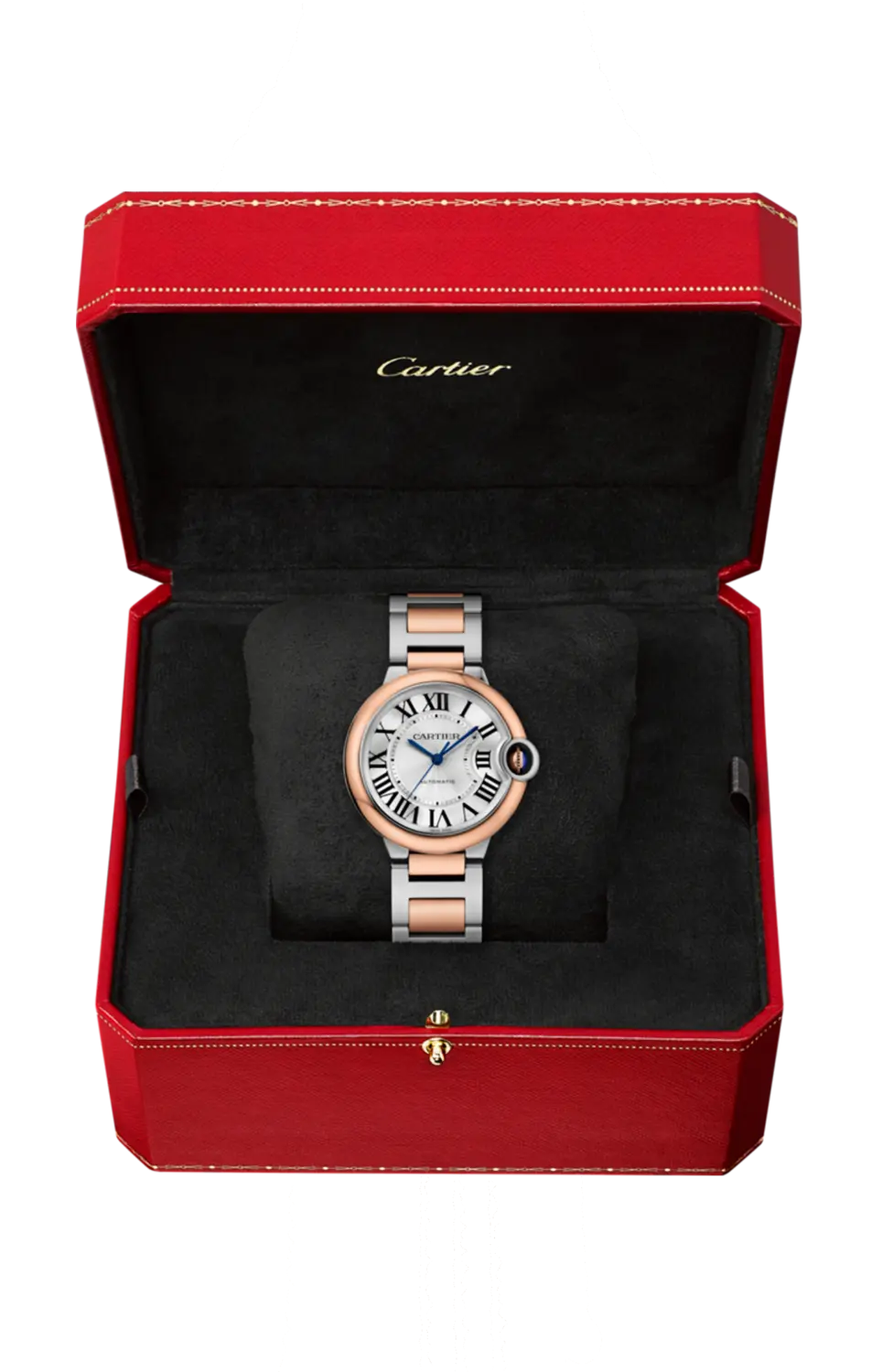 Часы Cartier с синим шариком, 36 мм. Механический механизм с автоподзаводом. Стальной корпус, безель из 18-каратного розового золота и консервированная заводная головка из 18-каратного розового золота с кабошоном из синтетической шпинели. Серебряный циферблат с гильошировкой. Стрелки в форме мечей из вороненой стали. Сапфировое стекло. Сменный двухцветный браслет. Толщина 12,1 мм. Водонепроницаемость до 30 метров.