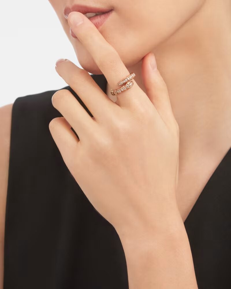 Кольцо Serpenti Viper из 18-каратного розового золота с бриллиантами паве, обладающее фирменным сочетанием чистой эстетики, обволакивающих форм и харизматичного чутья, - незаменимая интерпретация иконы бесконечных метаморфоз от Bvlgari. Запечатлев мощную и постоянно развивающуюся природу мифической змеи, это магнетическое ювелирное творение вдохновляет нас принять перемены как источник силы и уверенности в себе. Кольцо легко сочетать друг с другом, оно предлагает бесконечное количество вариантов укладки, воплощая в себе универсальный дух коллекции.