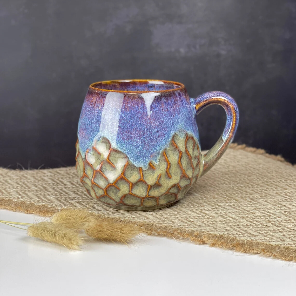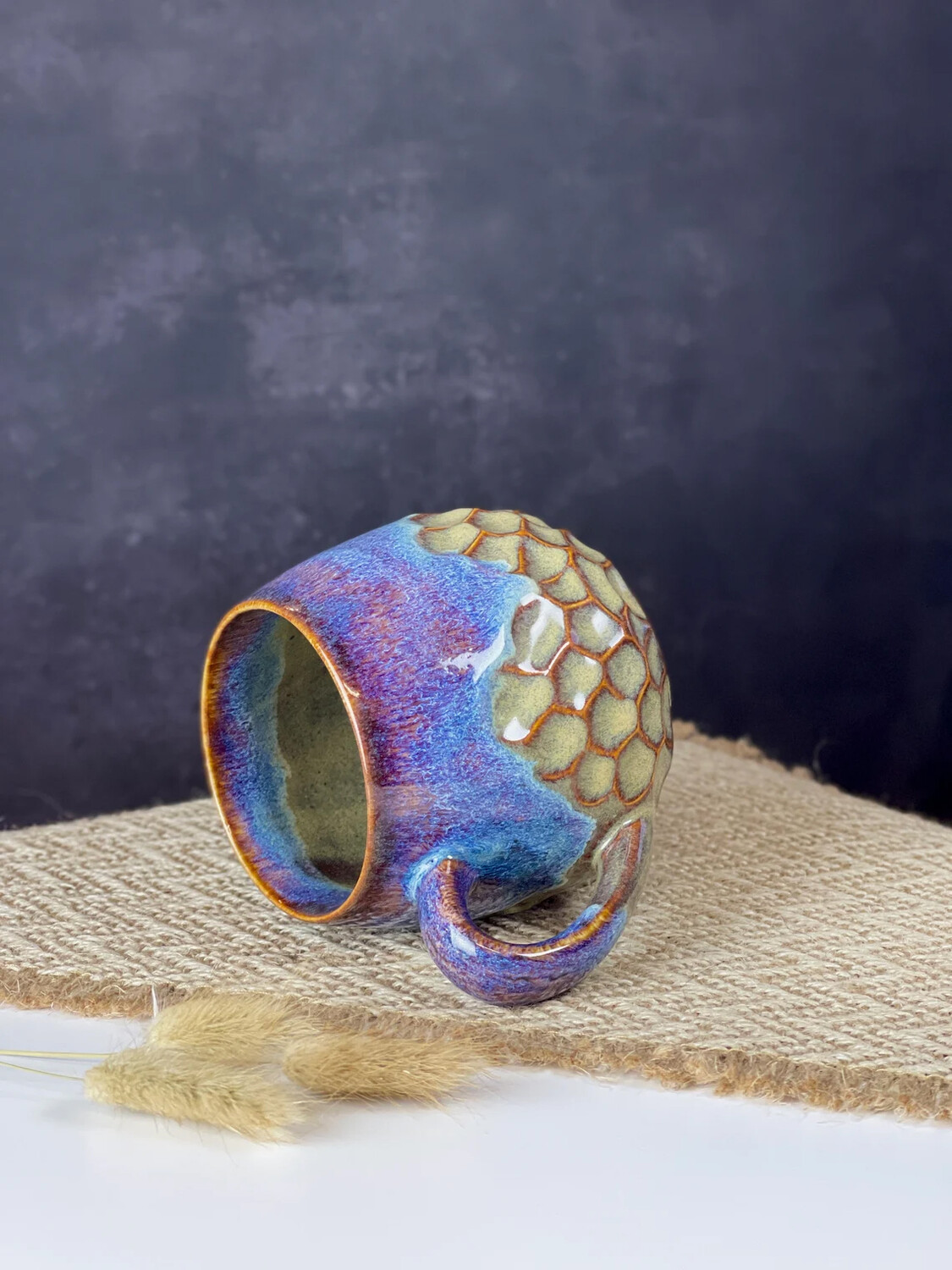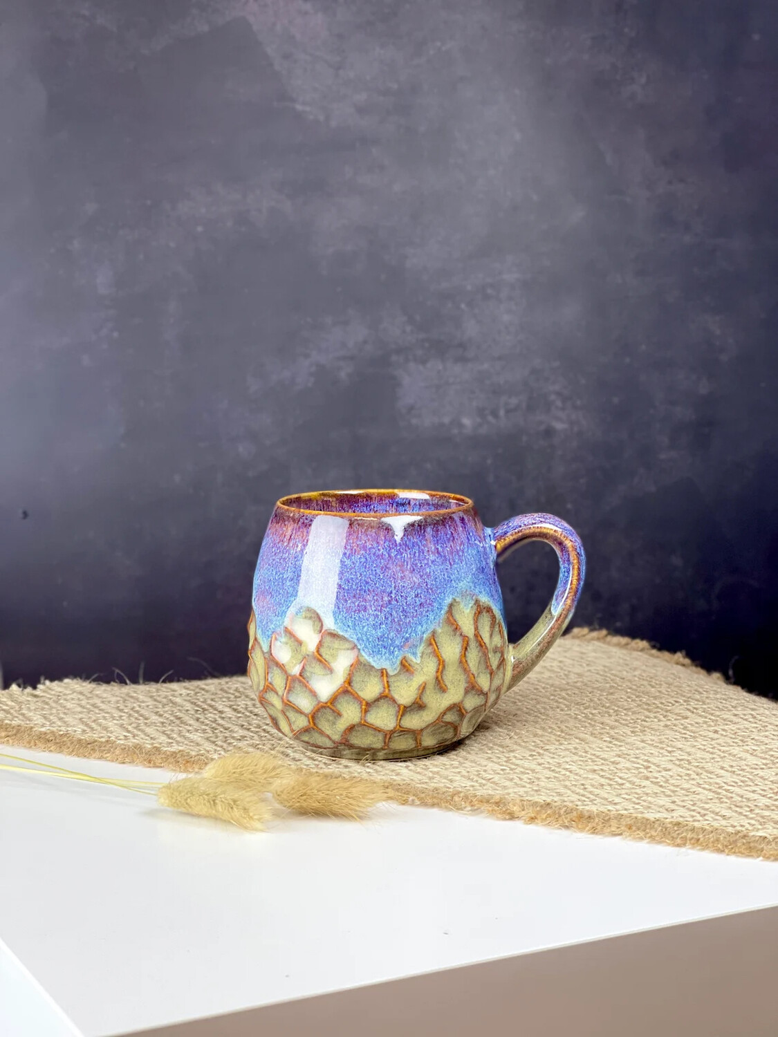 Эта круглая чашка объемом 350 мл действительно уникальна из-за своего невероятного цвета, который трудно описать. Это потрясающее сочетание синего и фиолетового с оттенками песочного цвета, создающее завораживающий визуальный эффект, напоминающий горную местность и разбивающиеся волны. Каждый раз, когда вы смотрите на эту чашку, вы переноситесь в безмятежный и спокойный пейзаж.