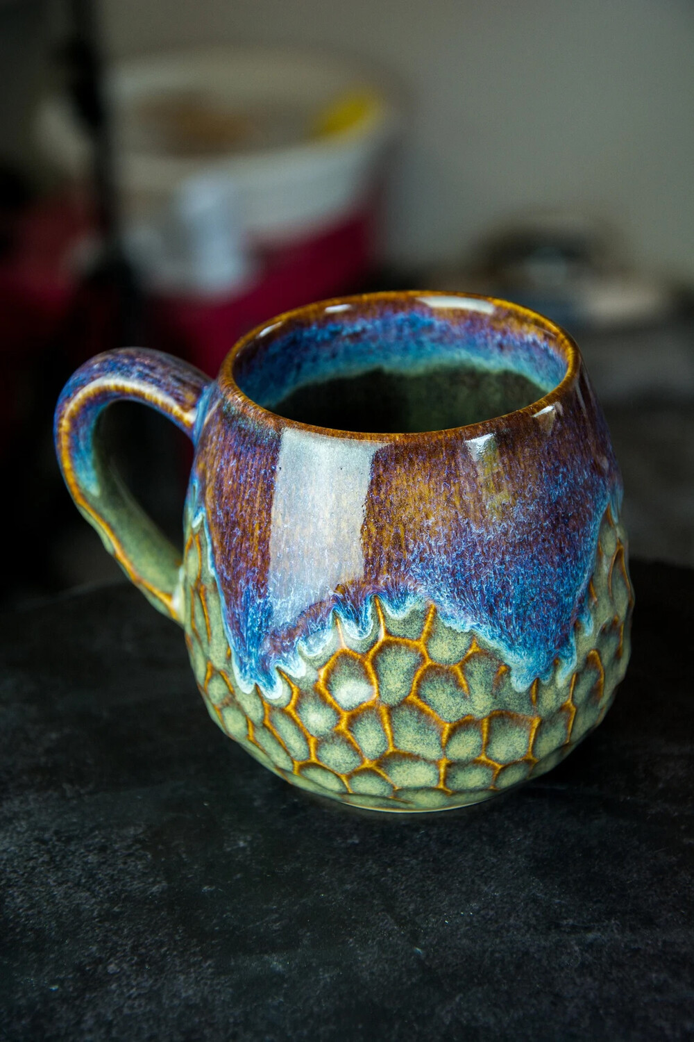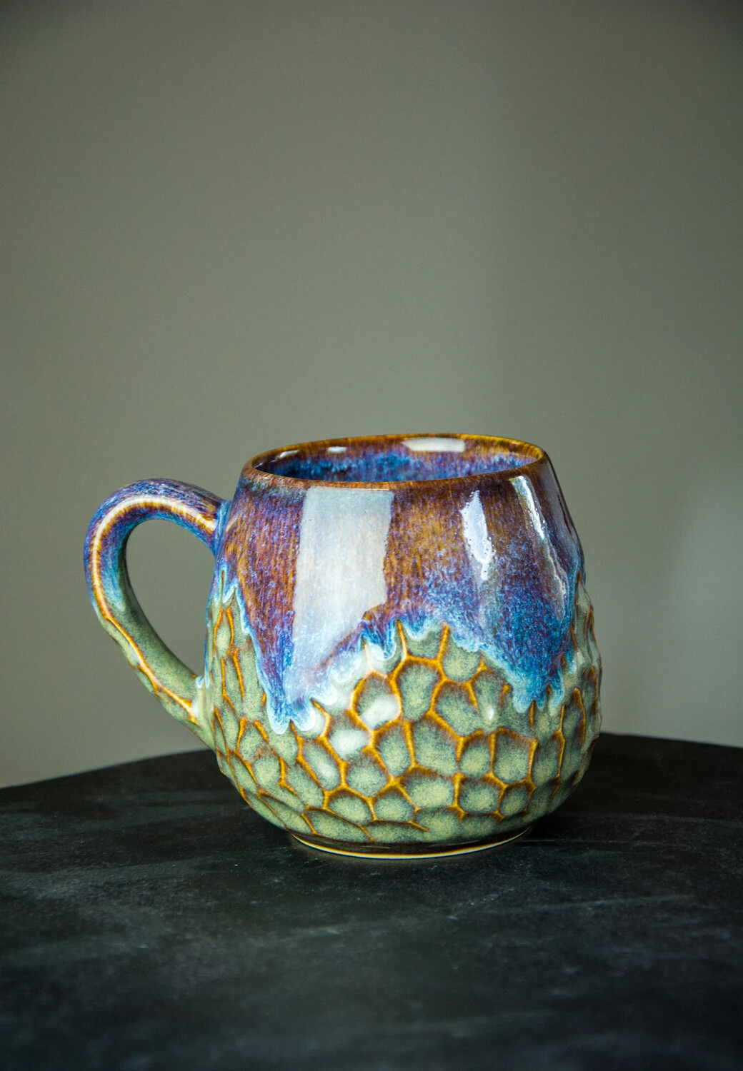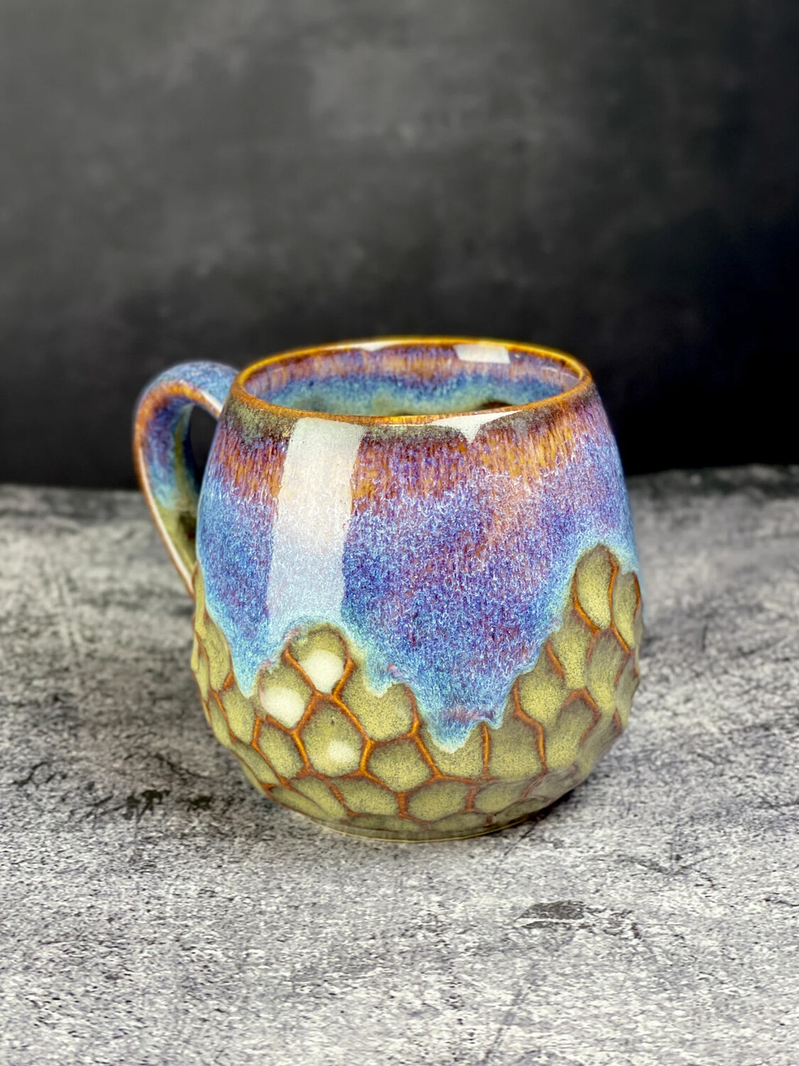 Эта круглая чашка объемом 350 мл действительно уникальна из-за своего невероятного цвета, который трудно описать. Это потрясающее сочетание синего и фиолетового с оттенками песочного цвета, создающее завораживающий визуальный эффект, напоминающий горную местность и разбивающиеся волны. Каждый раз, когда вы смотрите на эту чашку, вы переноситесь в безмятежный и спокойный пейзаж.