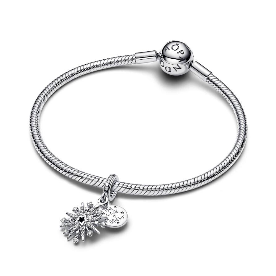 Добавьте нашу праздничную подвеску-шарм Sparkling Firework Double Dangle Charm в свою коллекцию, чтобы добавить звездного веселья. Изготовленная из стерлингового серебра, одна подвеска имеет вырезанную звезду с сияющими звездами, металлическими точками и сверкающими камнями, представляющими искры фейерверка, исходящие из центра. Вторая подвеска имеет сообщение «БУДУЩЕЕ ЯРКОЕ».