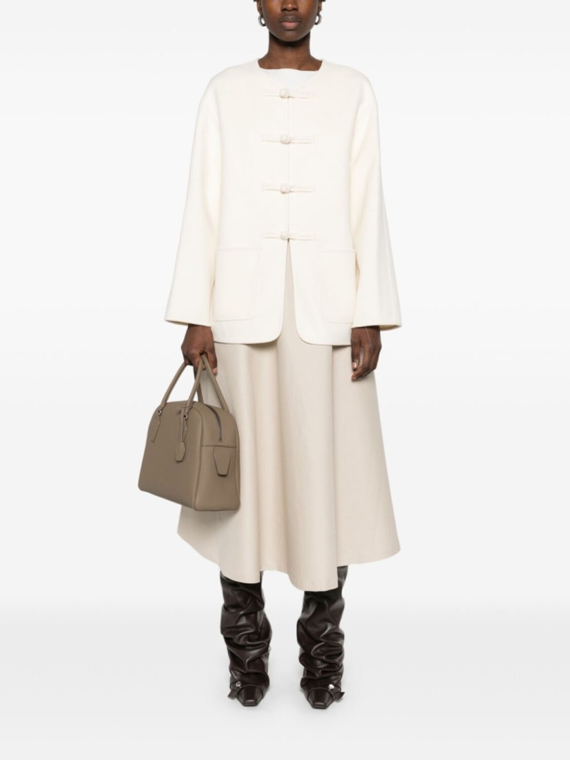 Экрю, застежка на пуговицах спереди, длинные рукава, два накладных кармана по бокам