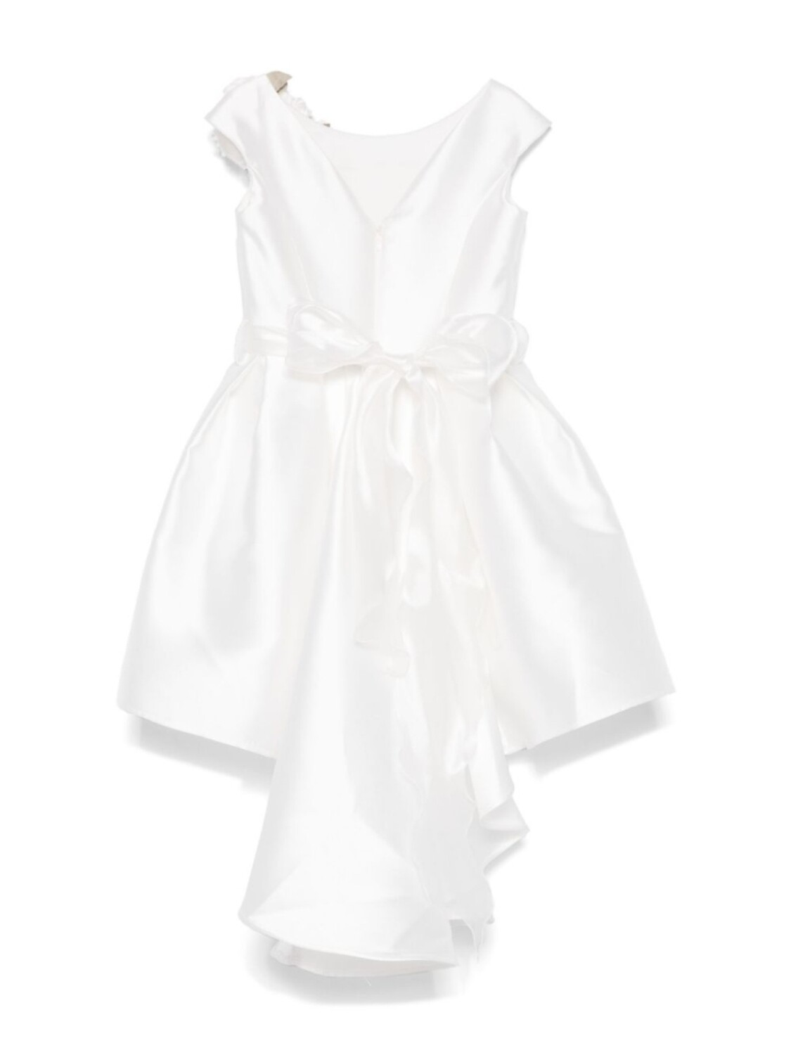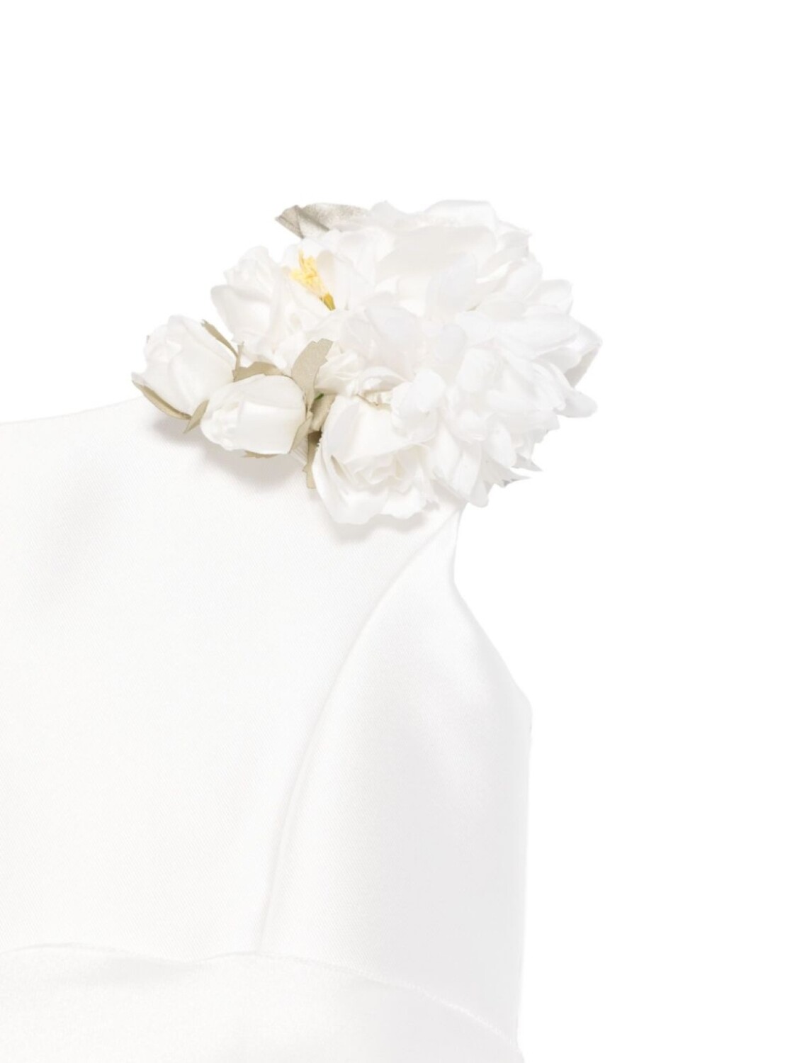 Белый, ткань сатин-дюшес, цветочная аппликация спереди, потайная застежка на молнии сзади, круглый вырез, без рукавов, съемный пояс, складки, цельная подкладка, А-образный силуэт, подол с баской