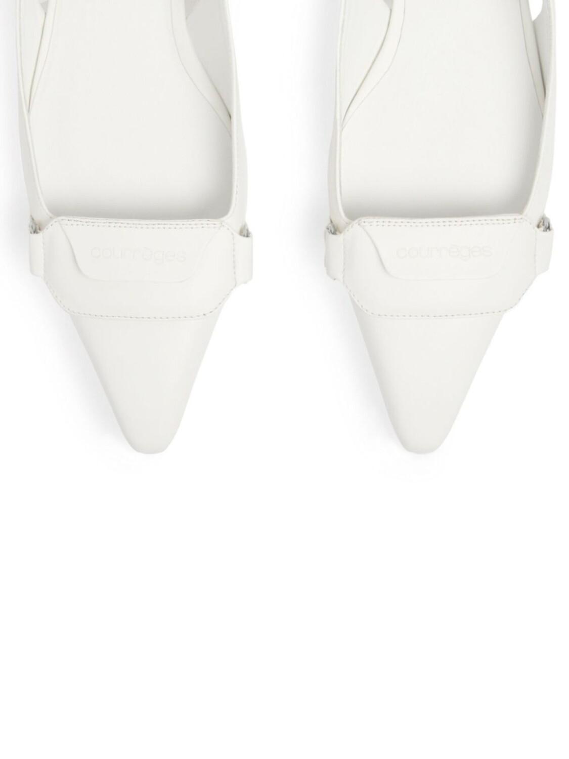 Белый, ремешок на пятке, серебристый металлический логотип, тисненый логотип спереди, заостренный носок