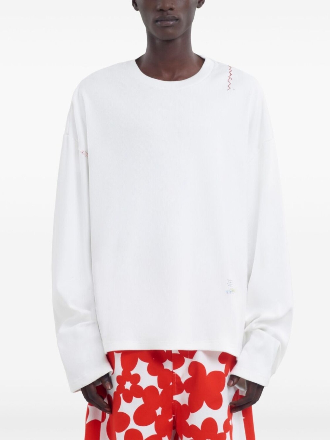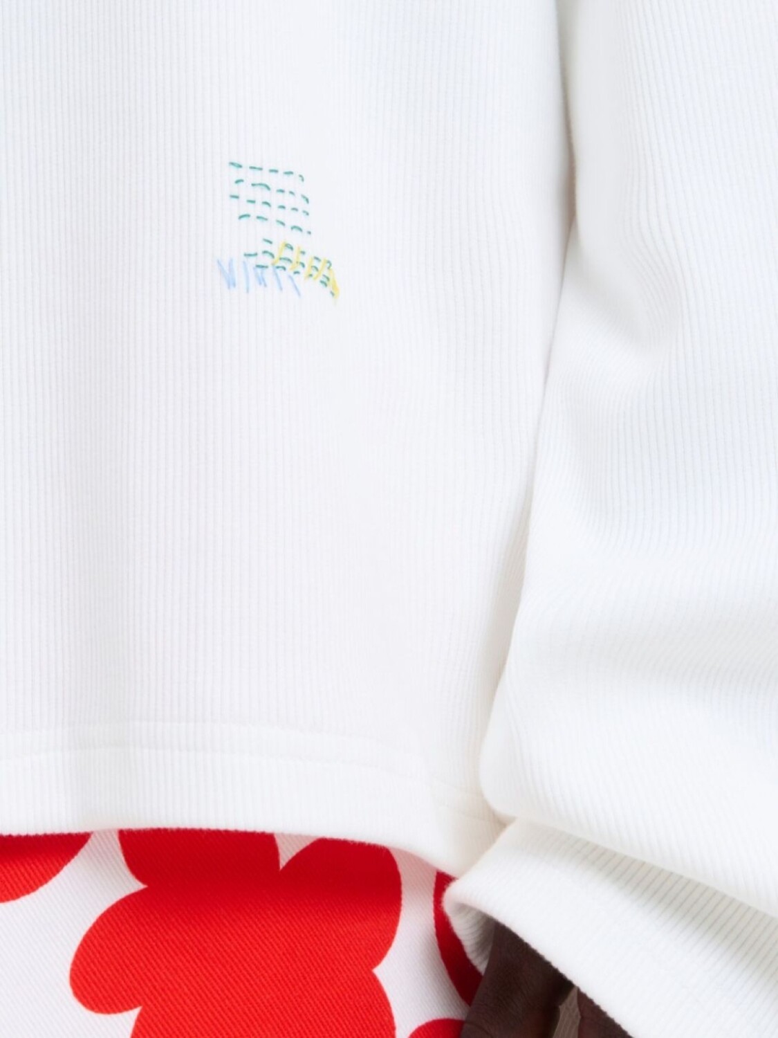 Белый, эластичный хлопок, ткань джерси, круглый вырез, вышитый логотип сбоку, длинные рукава, декоративная строчка, прямой подол