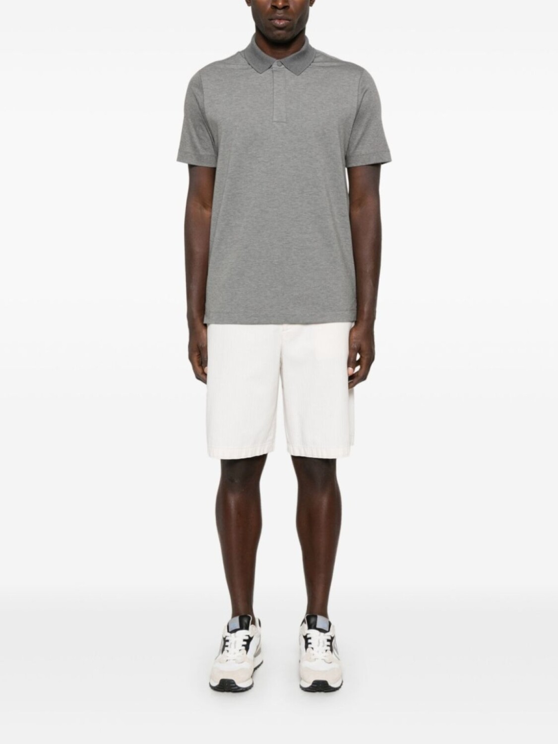 Светло-серый, короткая застежка на пуговицах спереди, воротник поло, короткие рукава, разрезы по бокам