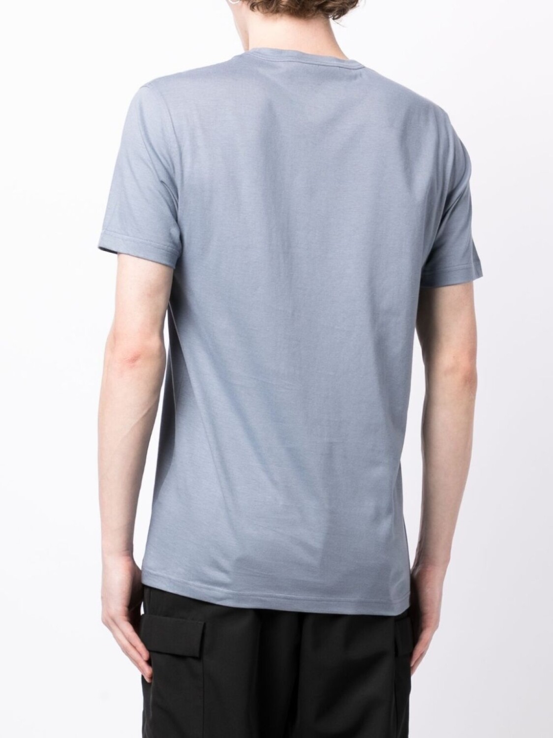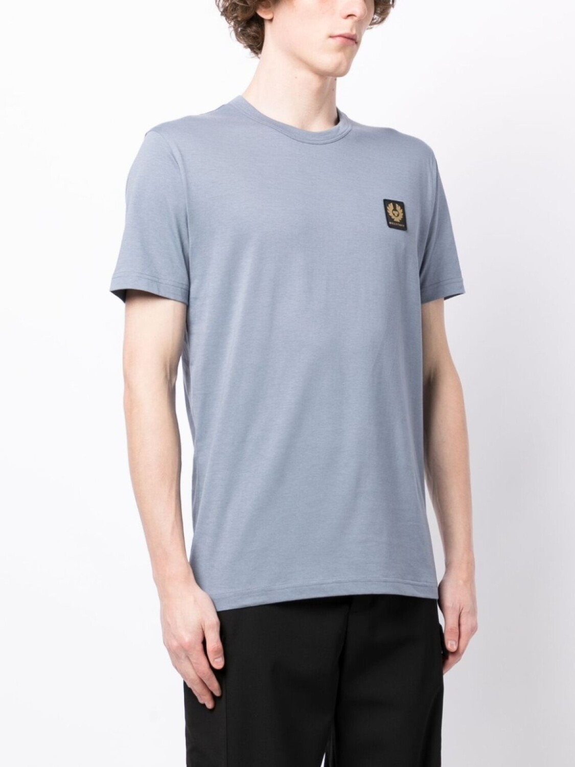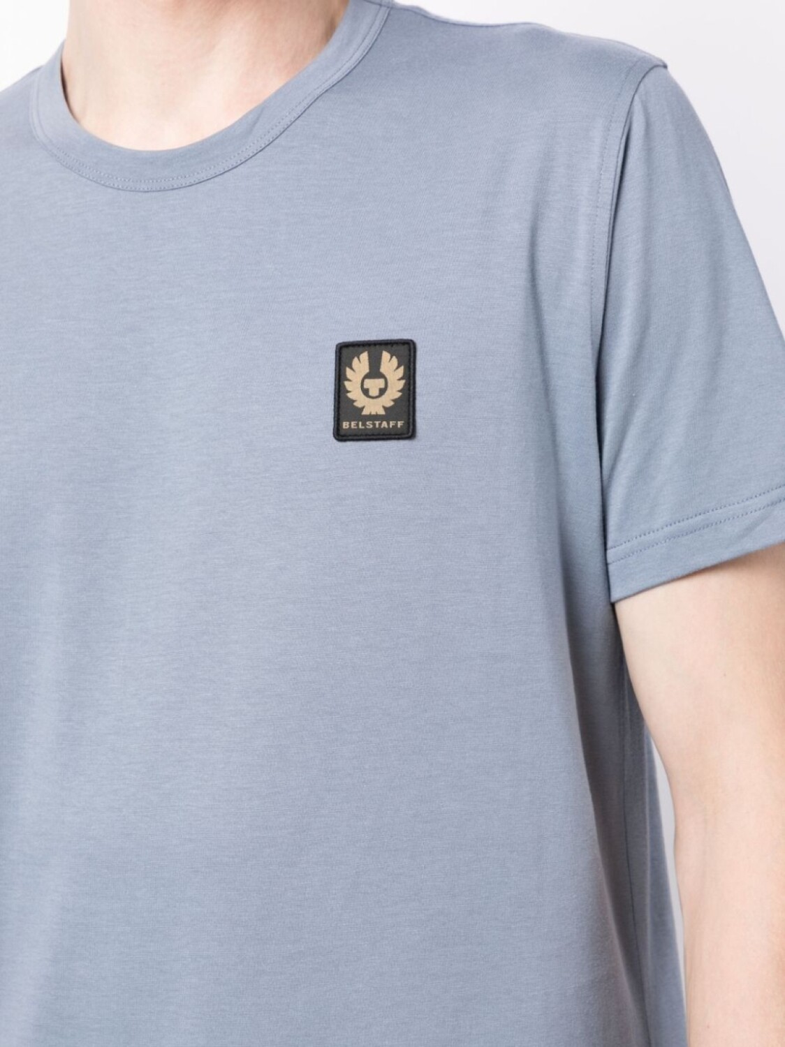 Пастельно-синий, хлопок, нашивка с логотипом на груди, круглый вырез, короткие рукава и прямой подол.