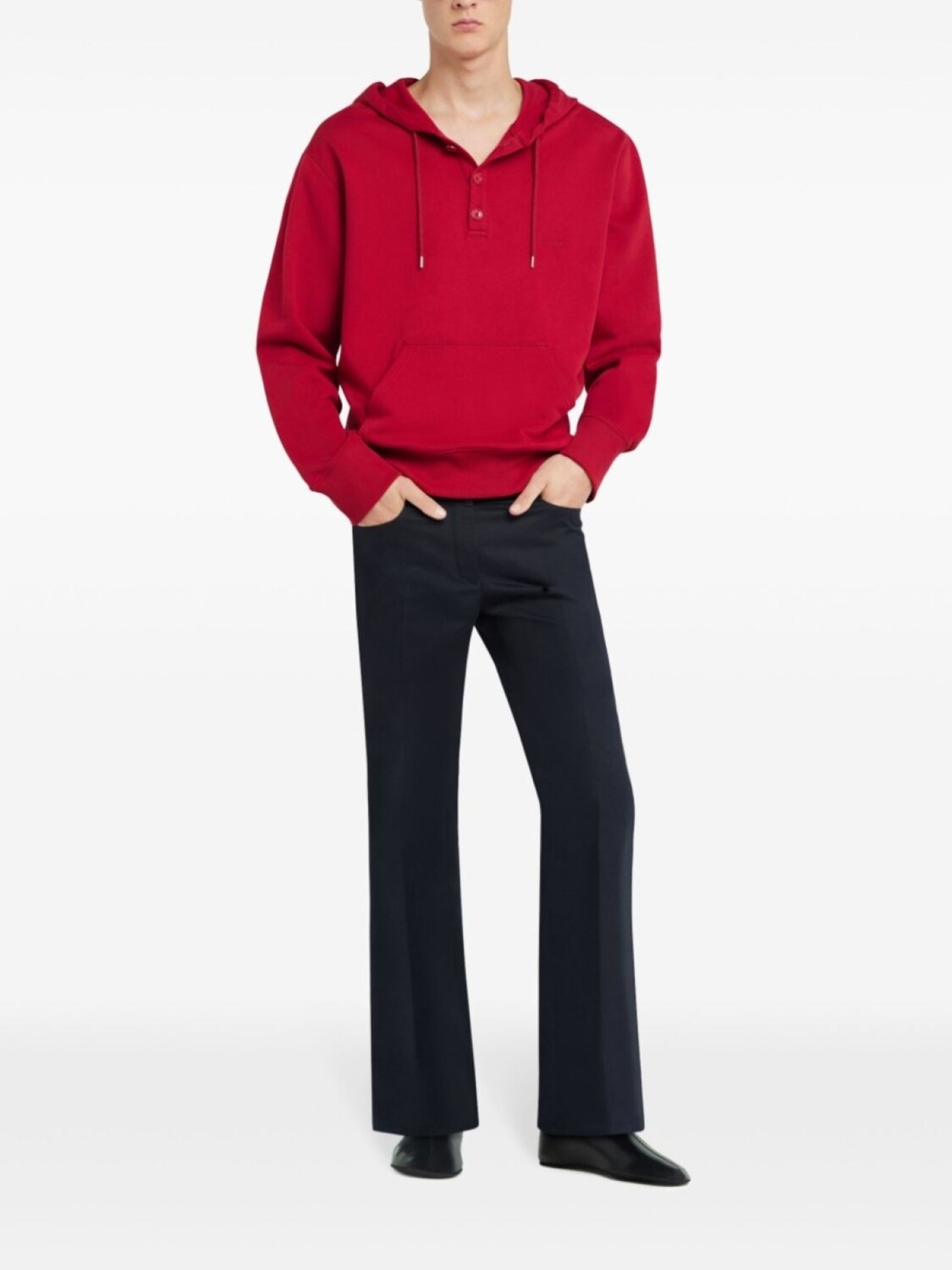 Темно-красный, затягивающийся на шнурок капюшон, длинные рукава, накладной карман спереди, Это унисекс-модель. Обратите внимание, что для нее используется мужская размерная сетка.