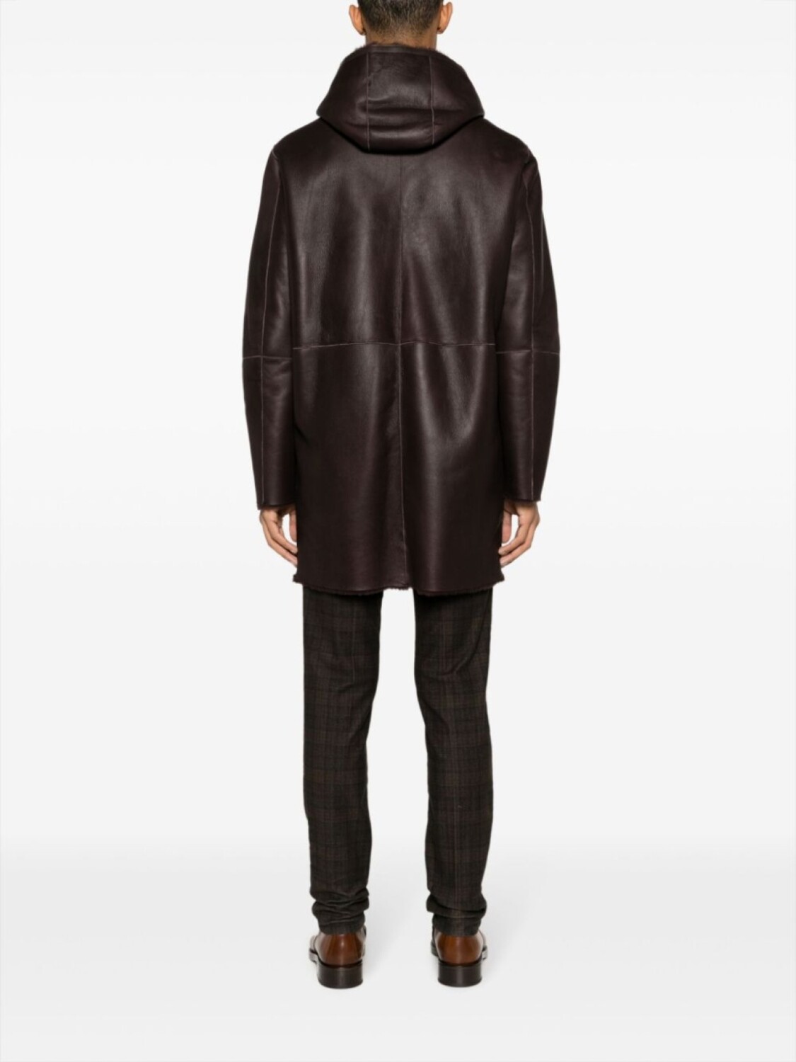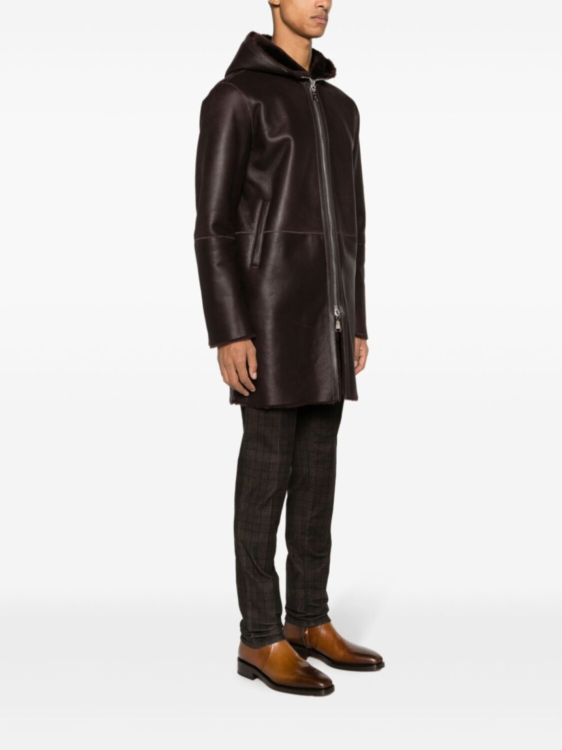 Серо-коричневый, кожа, подкладка из овечьей шерсти, классический капюшон, двусторонняя молния спереди, длинные рукава, два вшитых кармана по бокам, длина до бедер и прямой подол.