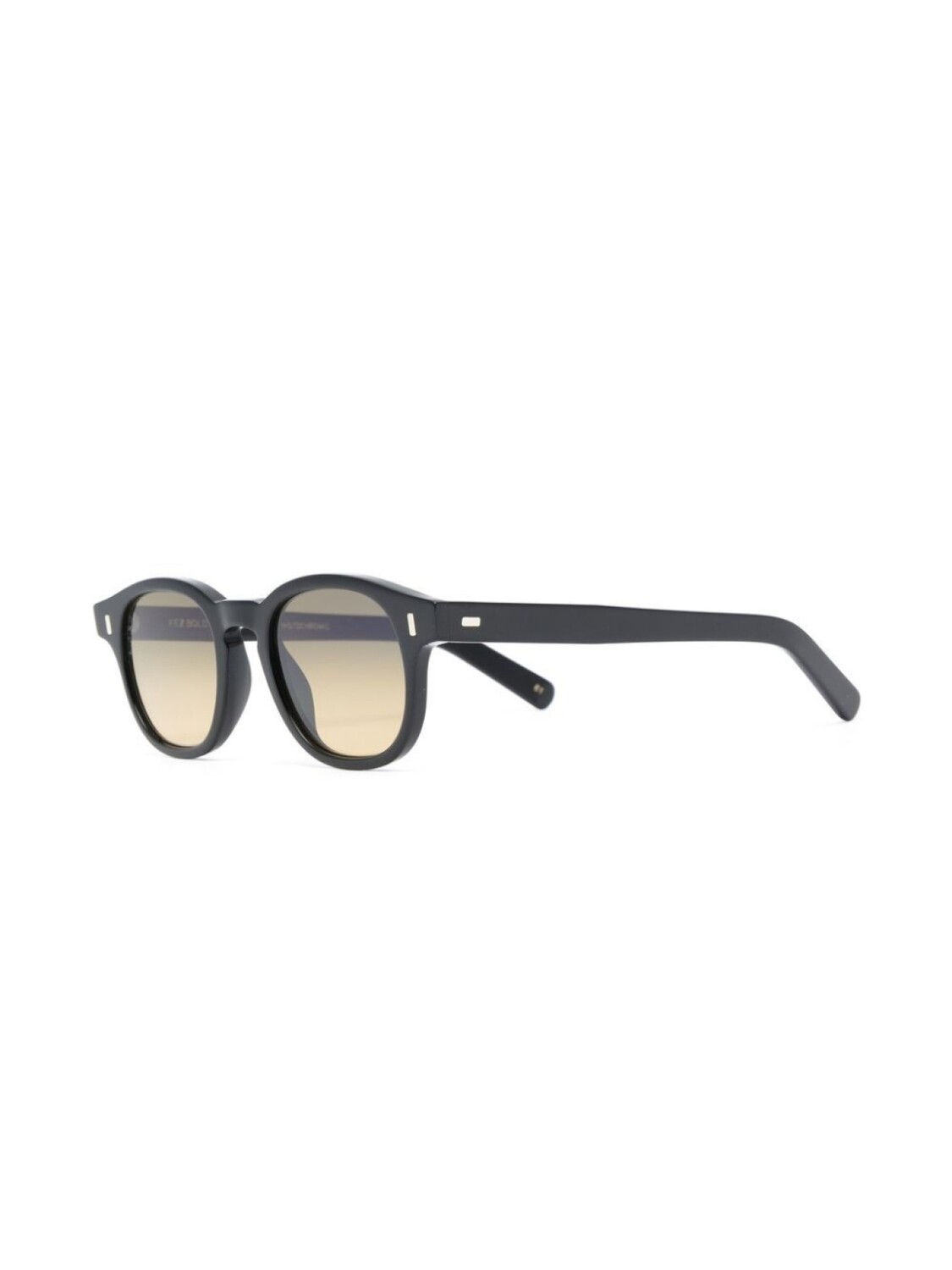 Черный, ацетат, тонированные линзы, круглая оправа, прямые дужки, изогнутые кончики. Очки поставляются с защитным футляром.