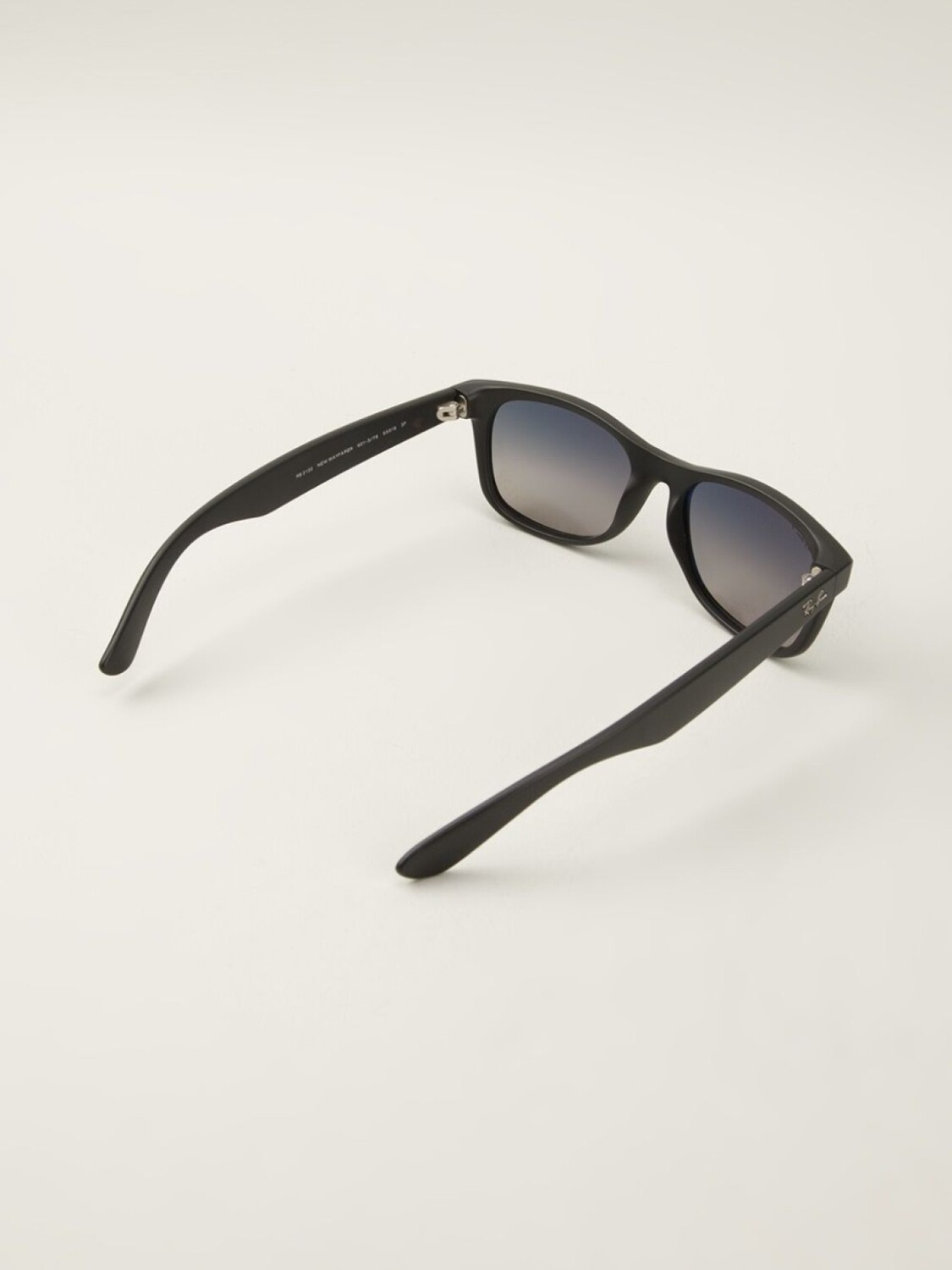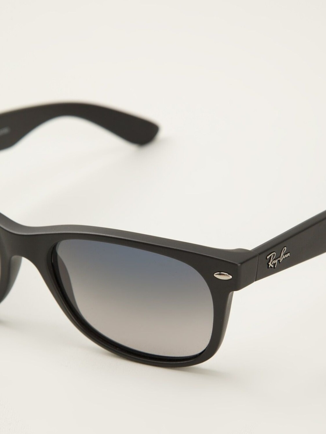Солнцезащитные очки 'New Wayfarer Classic' от Ray Ban (Рэй Бан). Квадратная оправа, серебристая фурнитура, логотип на дужке и прямые дужки с остро изогнутыми концами.