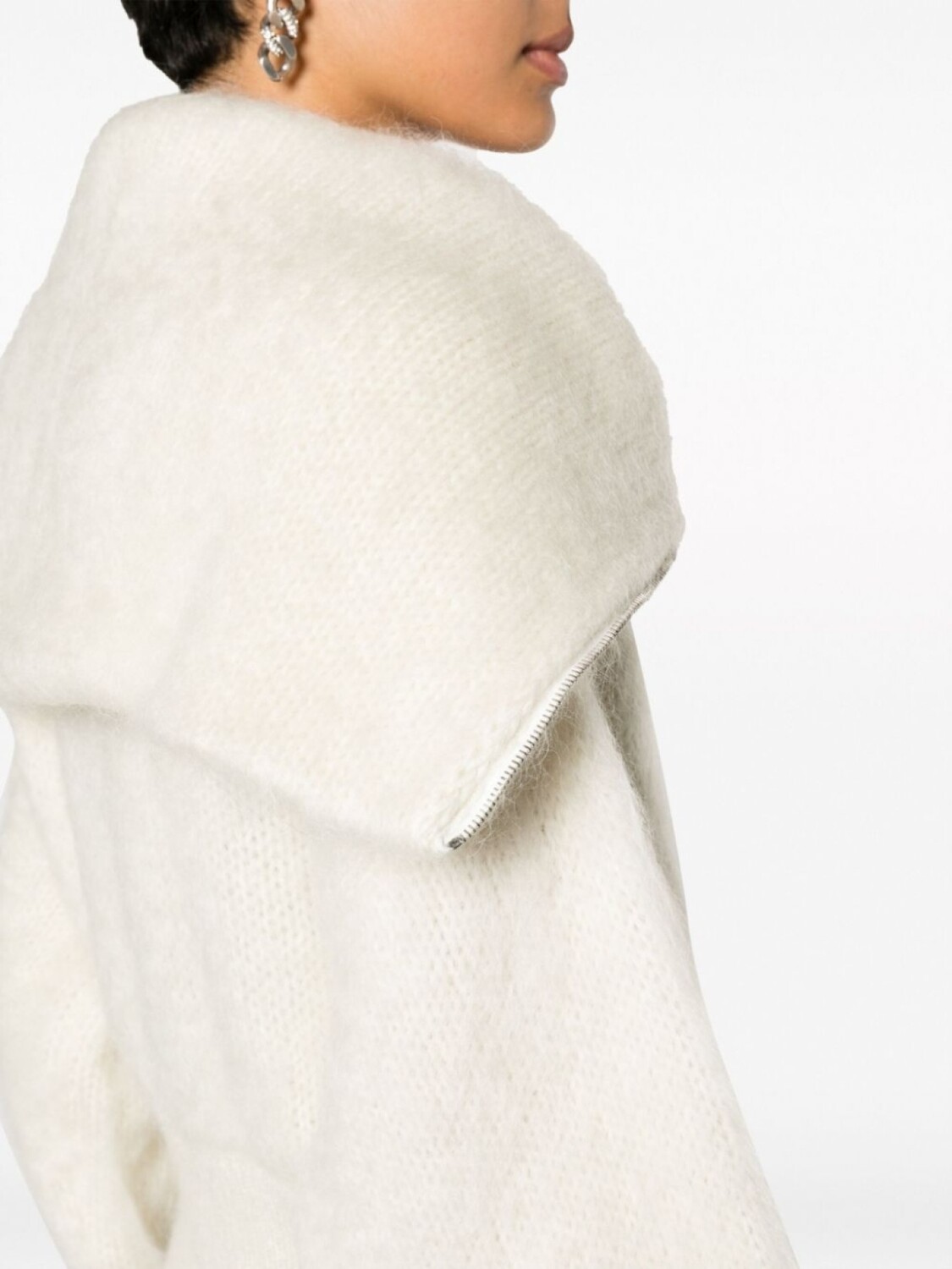 Цвет слоновой кости, смесовый мохер, трикотажный материал, широкие заостренные лацканы, двусторонняя молния спереди, объемные рукава и прямой подол.