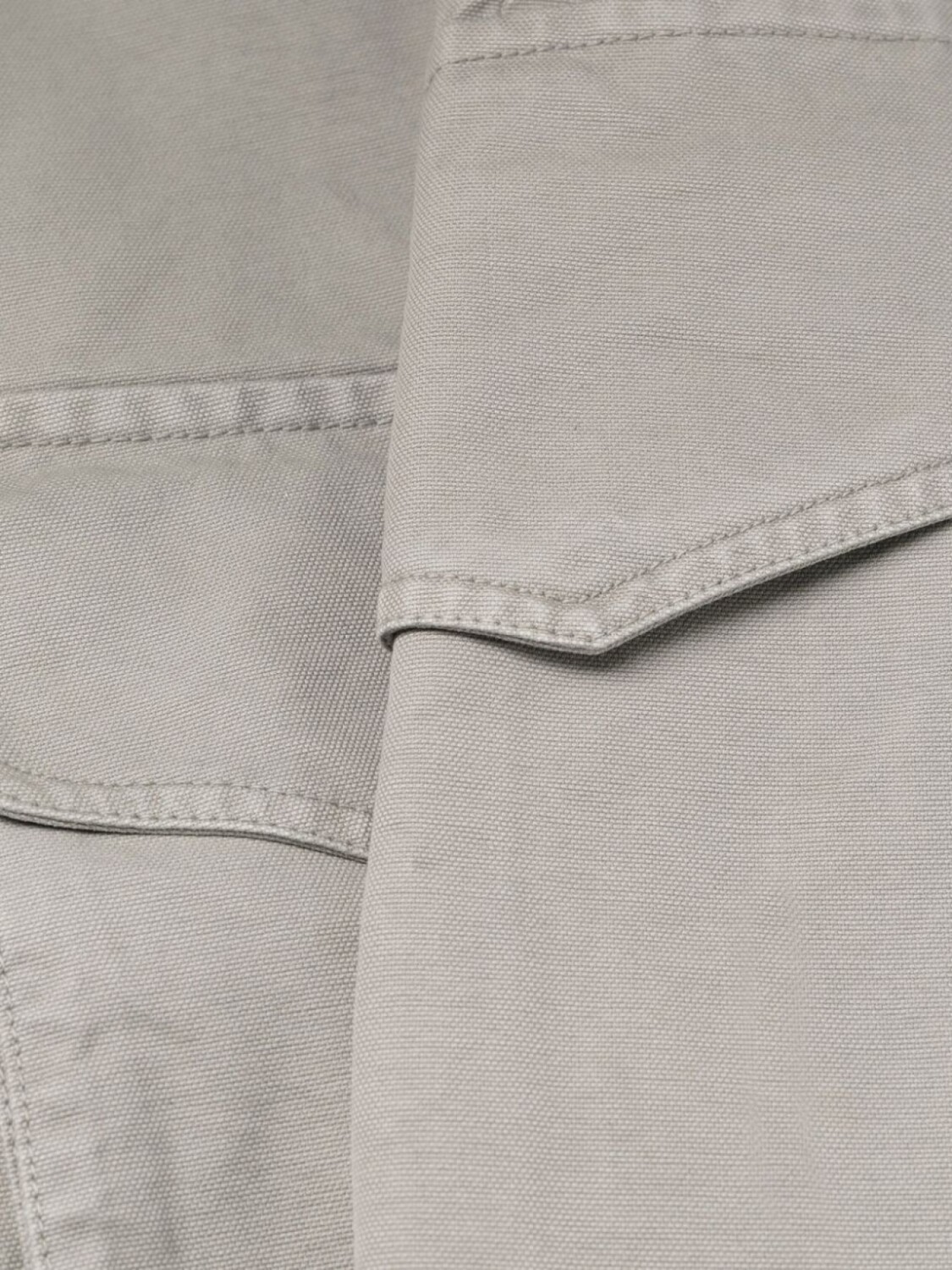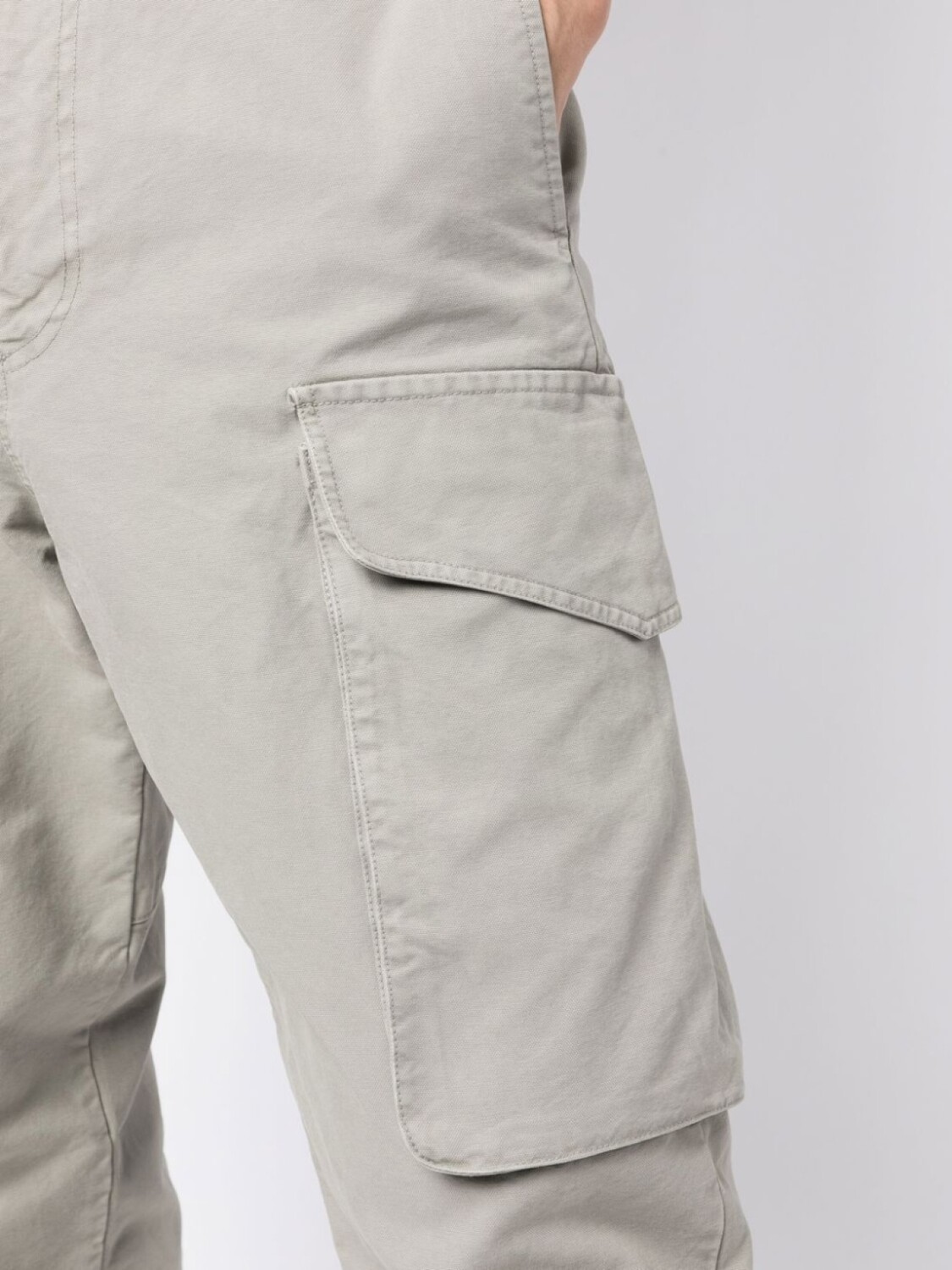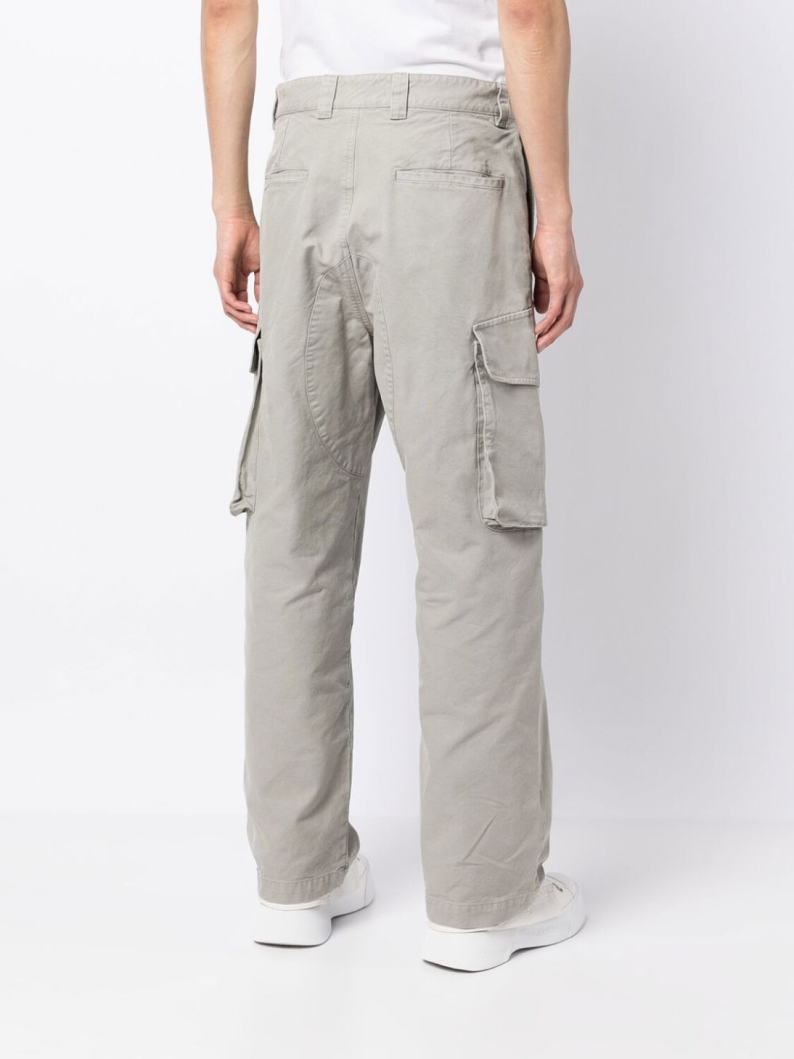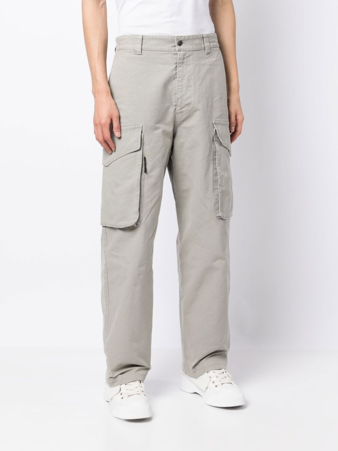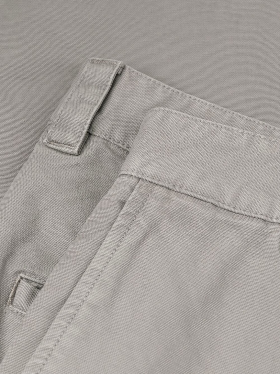 Холодный серый, хлопок, петли для ремня, ширинка на молнии, накладные карманы и прямой крой.
