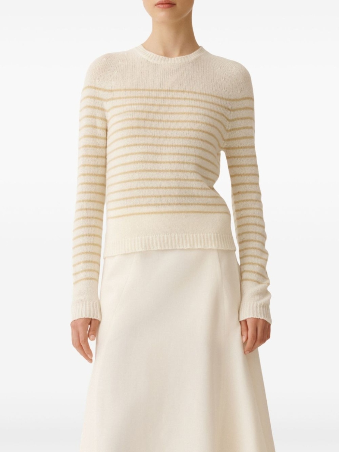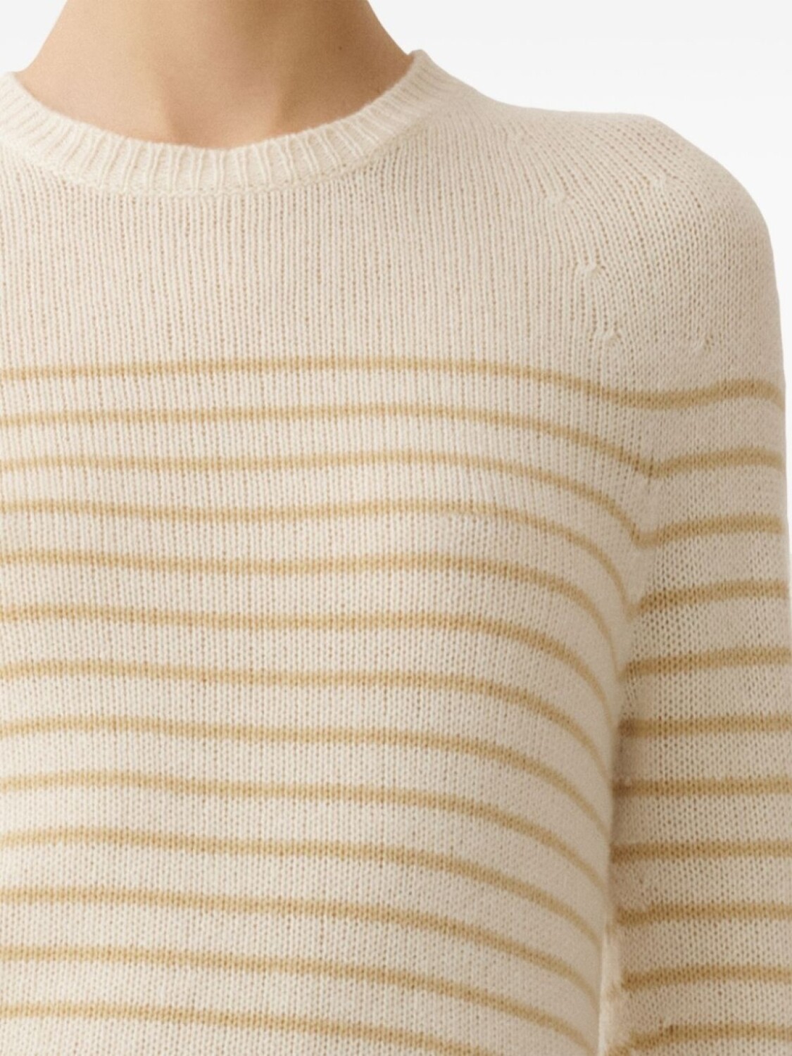 Экрю, круглый вырез, длинные рукава, подол и манжеты в рубчик, узор в горизонтальную полоску
