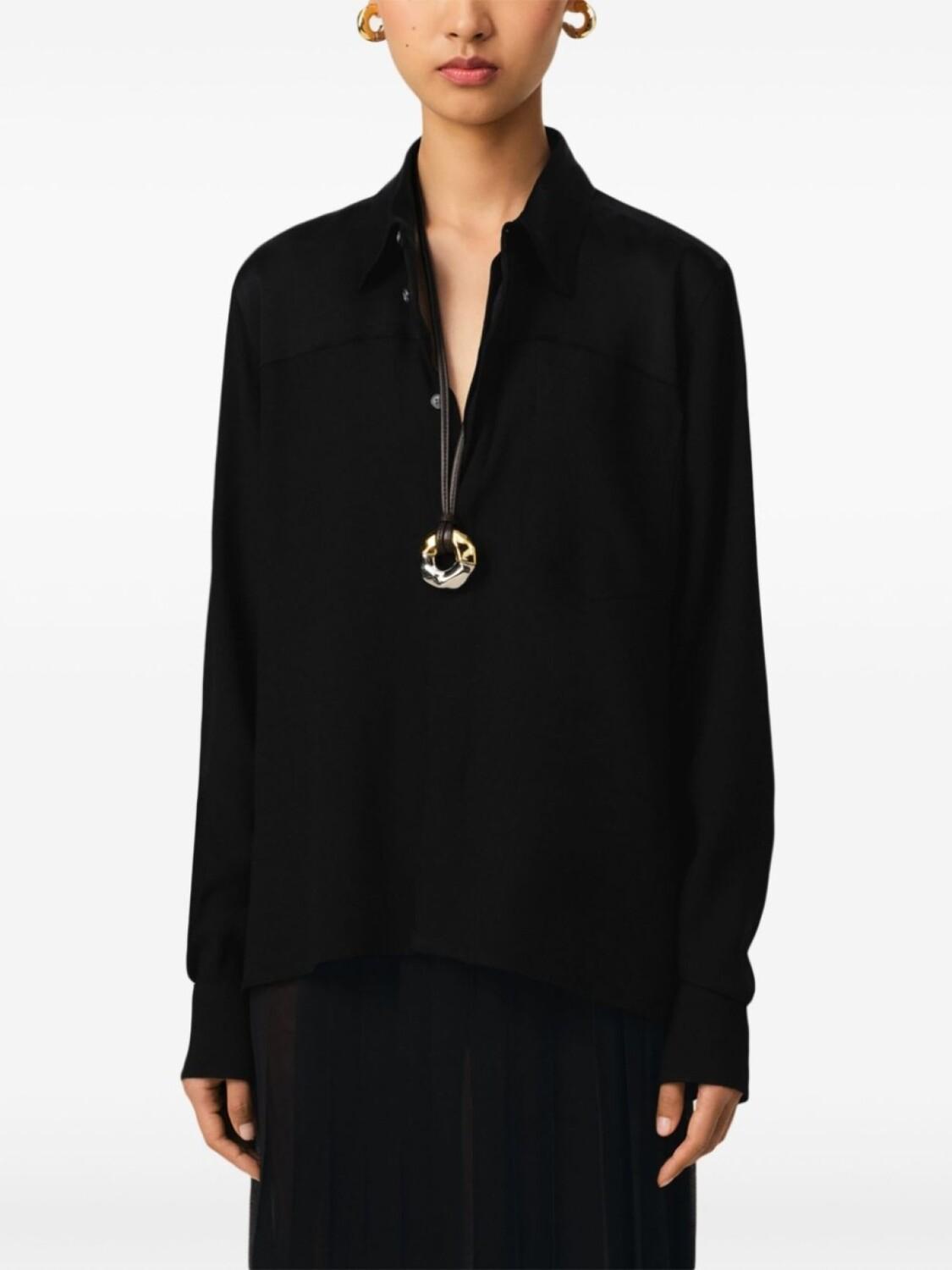Черный, потайная пуговичная застежка спереди, нагрудный накладной карман, манжеты на пуговицах, прямой воротник