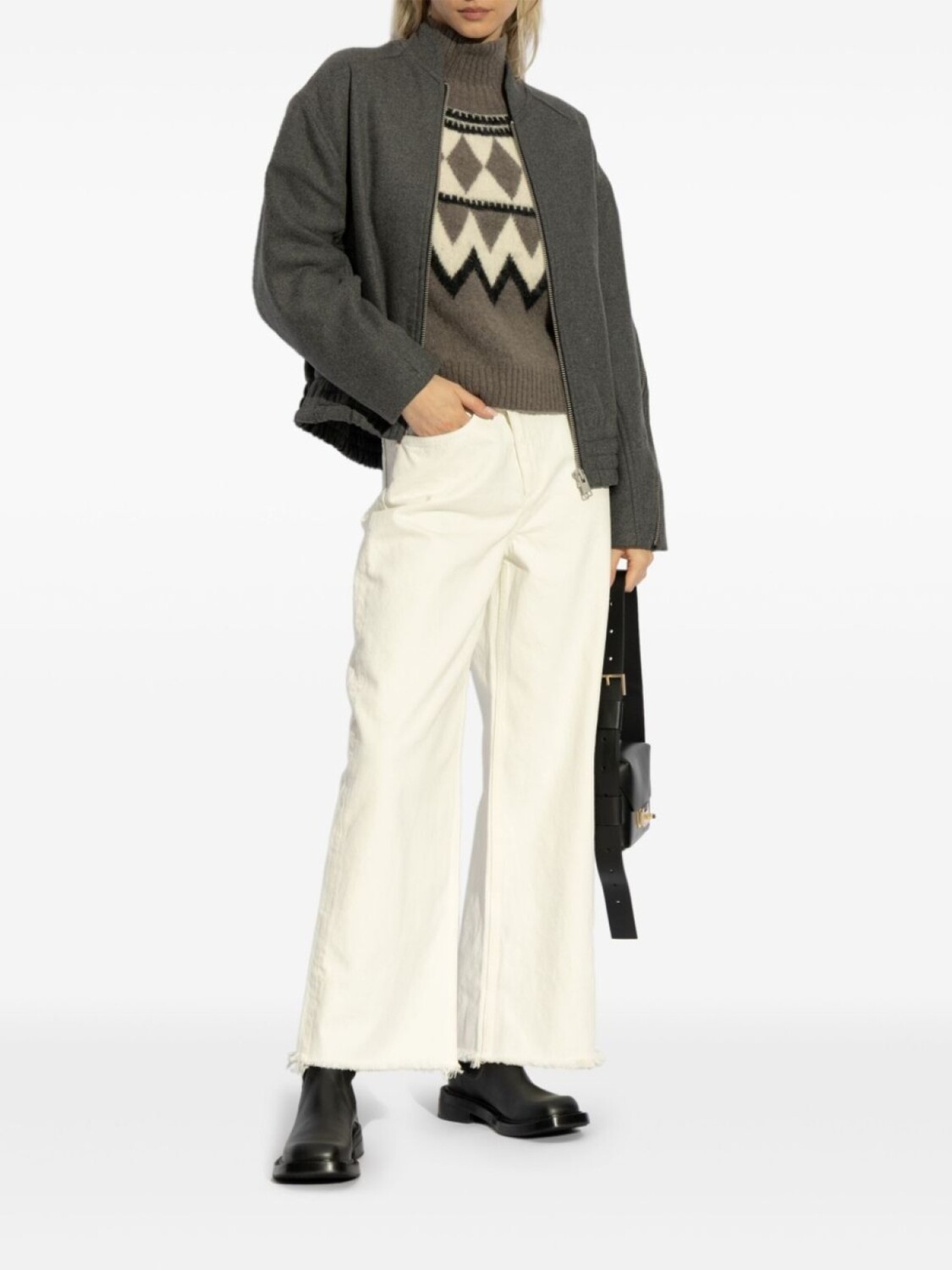 Белая смещенная застежка на пуговицы спереди, классические пять карманов, широкие штанины, необработанный край