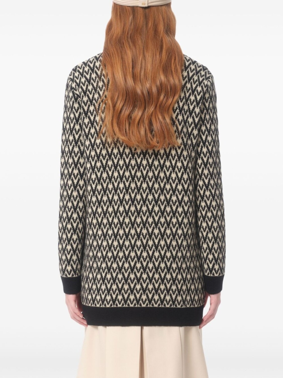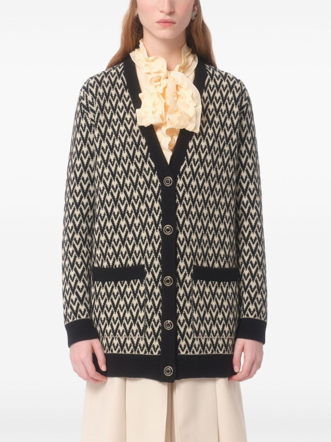 Черный, бежевый, вирджинская шерсть, вязаный дизайн, узор с изображением монограммы, застежка на пуговицах спереди, V-образный вырез в рубчик, два накладных кармана по бокам, длинные рукава, подол и манжеты в рубчик, прямой подол