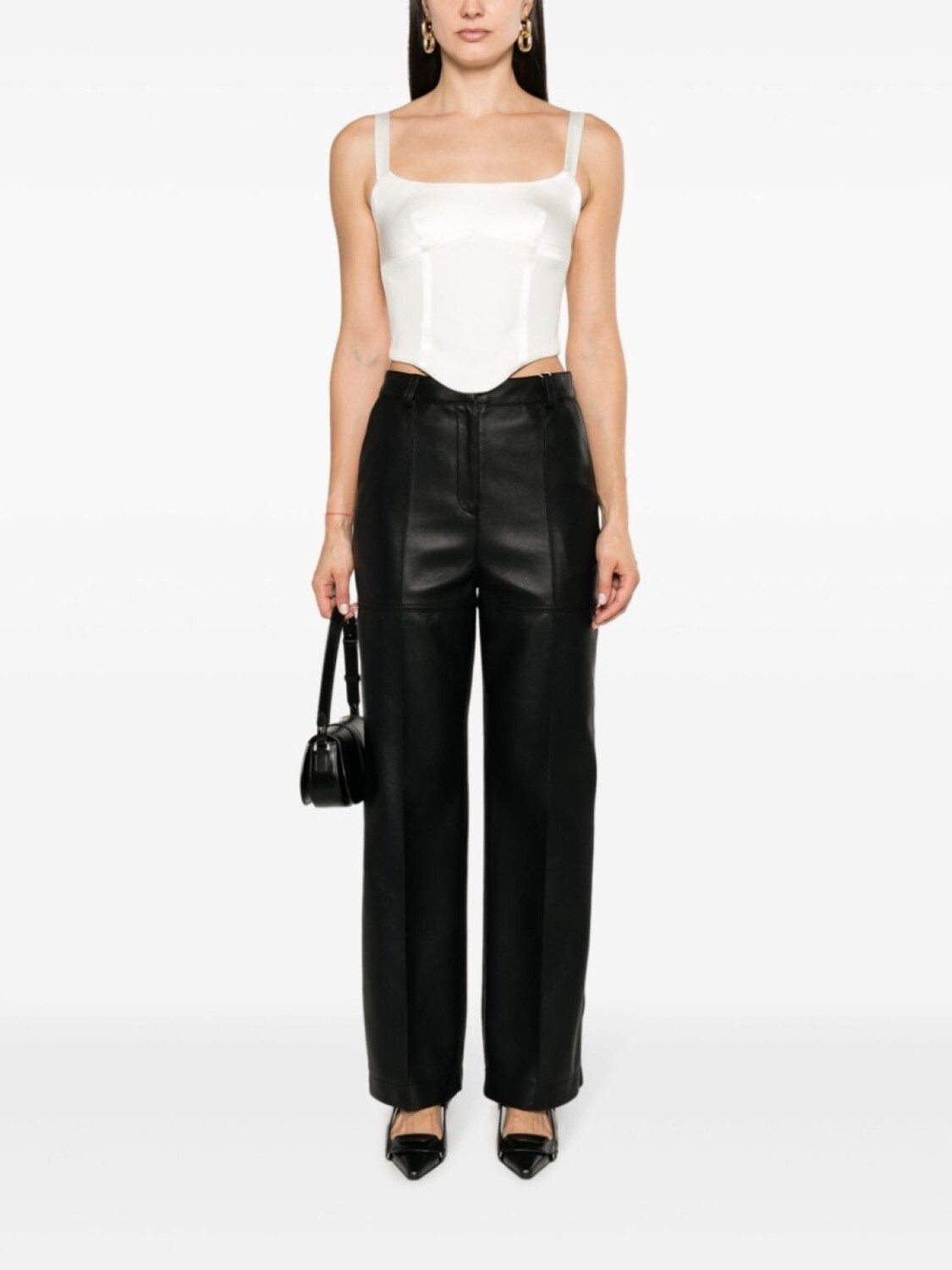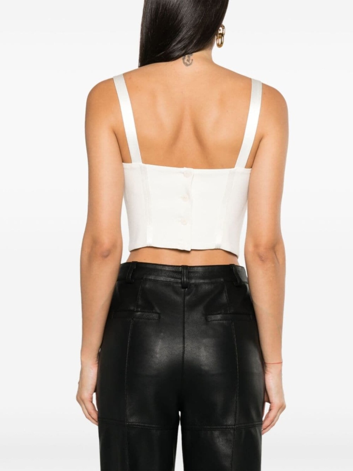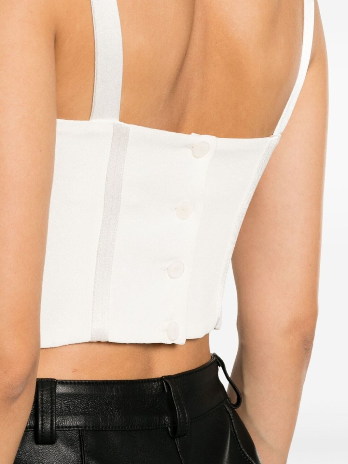 Цвет слоновой кости, ткань с сатиновым переплетением, вставки, креповая текстура, верх в корсетном стиле, строчка в тон, швы, U-образный вырез, узкие бретели, застежка на пуговицы сзади, неравномерный подол и цельная подкладка.