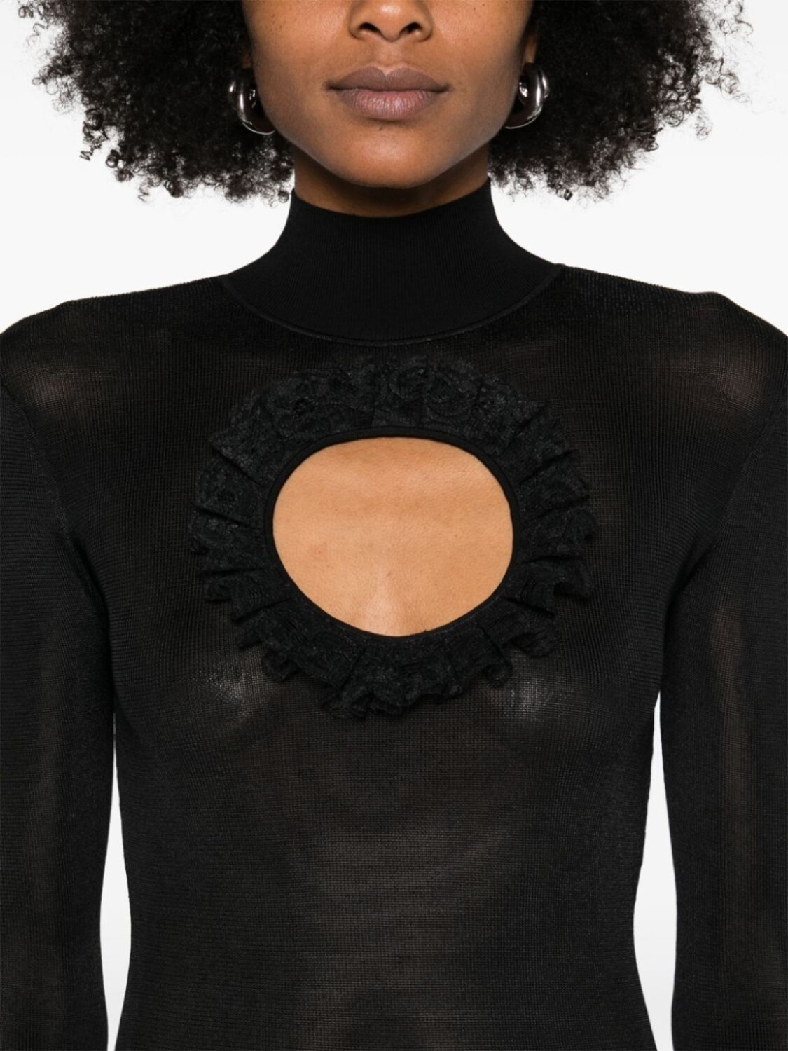 Черный, высокий воротник, длинные рукава, вставки с оборками