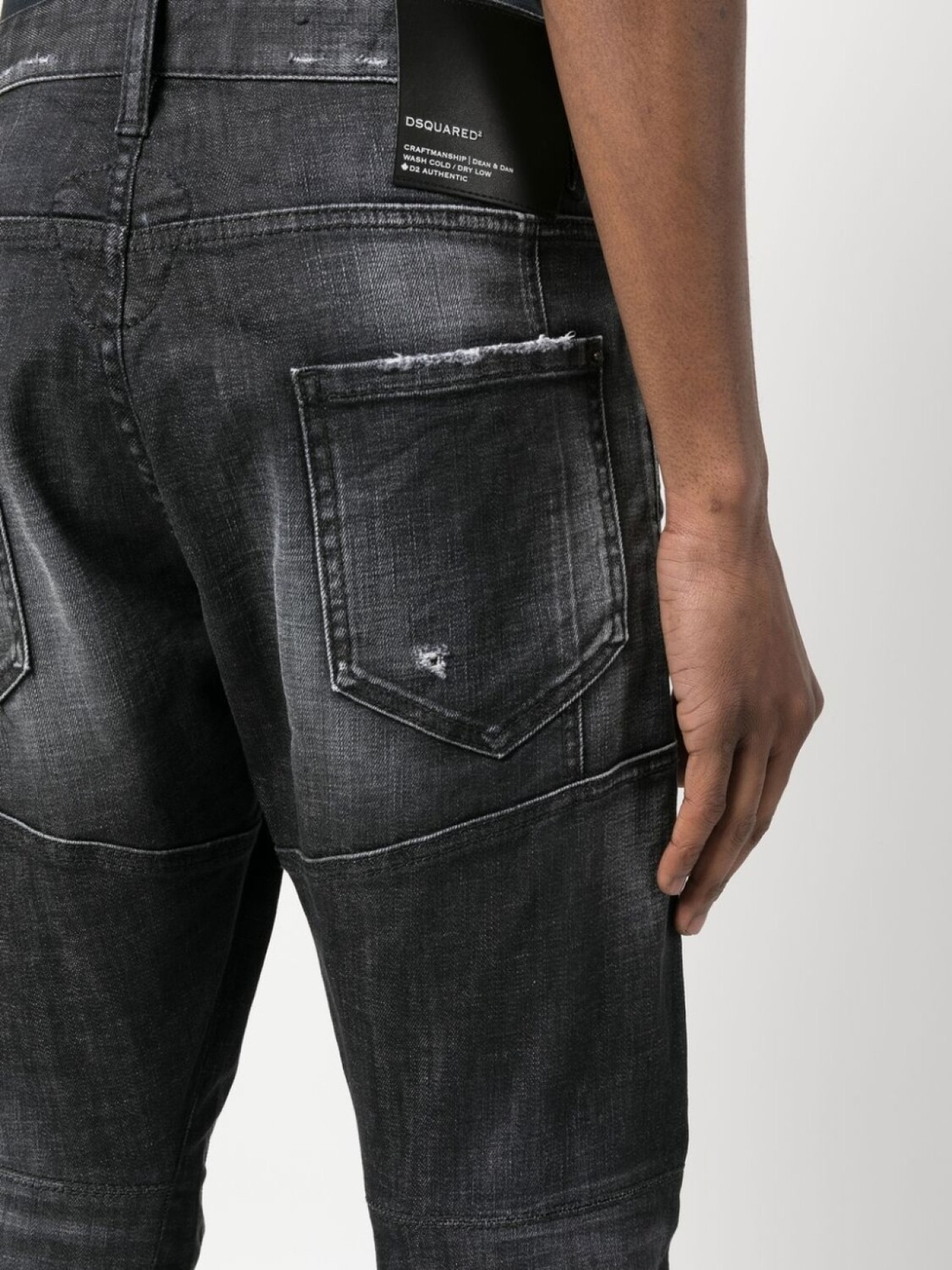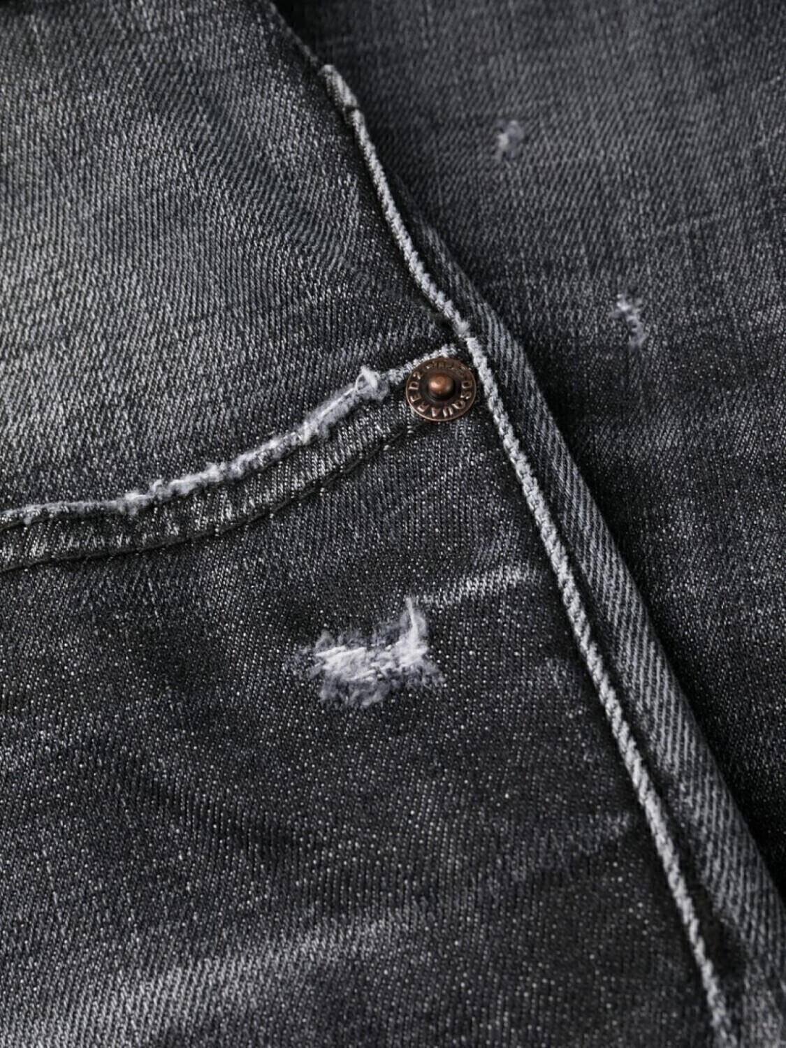 Черный, эластичный хлопок, обработанный деним, эффект потертости, декоративные складки, узкий крой, ширинка на пуговицах и пять карманов.
