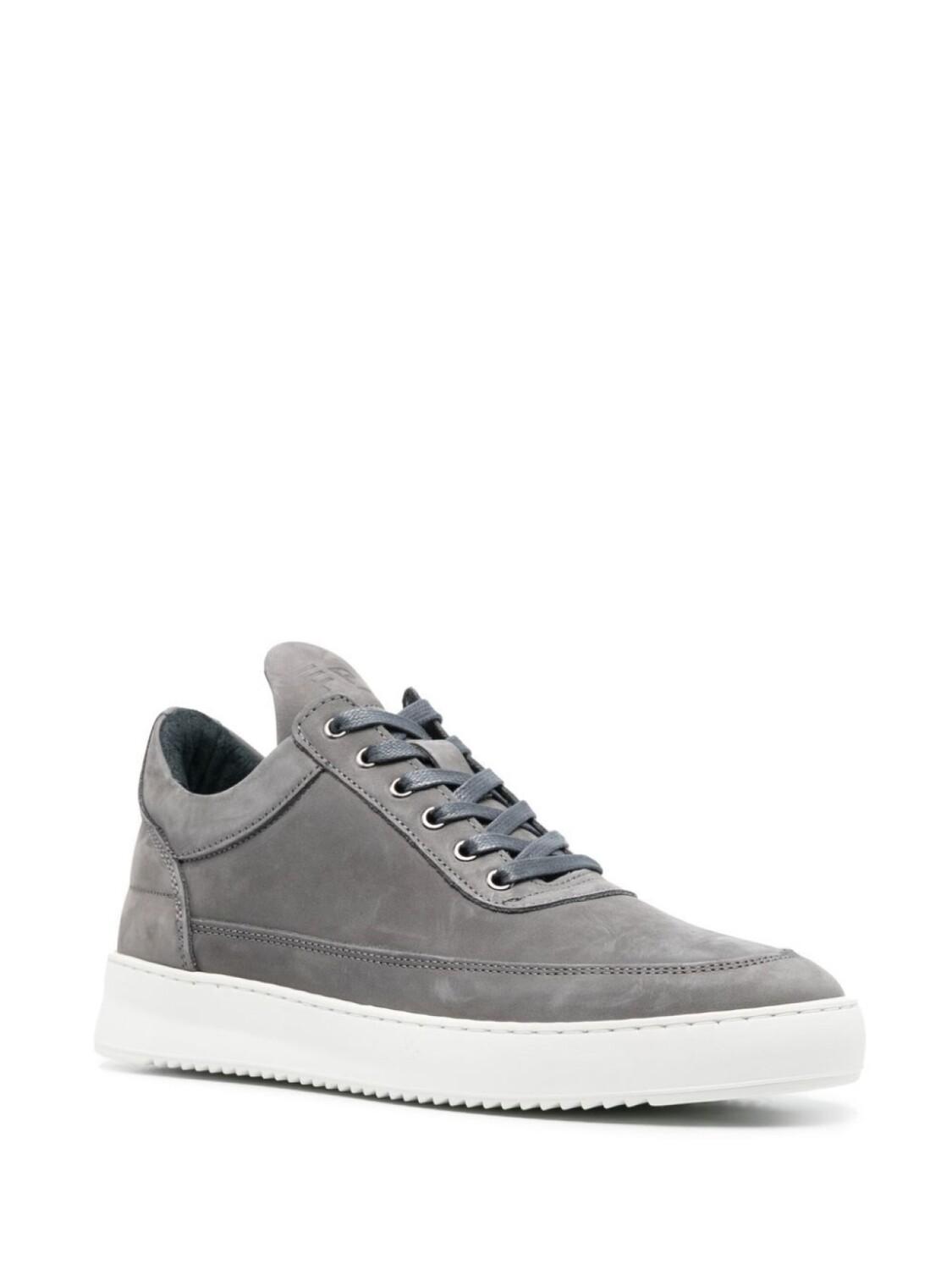 Серый бетон, телячья кожа, закругленный носок, шнуровка спереди, язычок с логотипом, уплотненная щиколотка и плоская резиновая подошва.