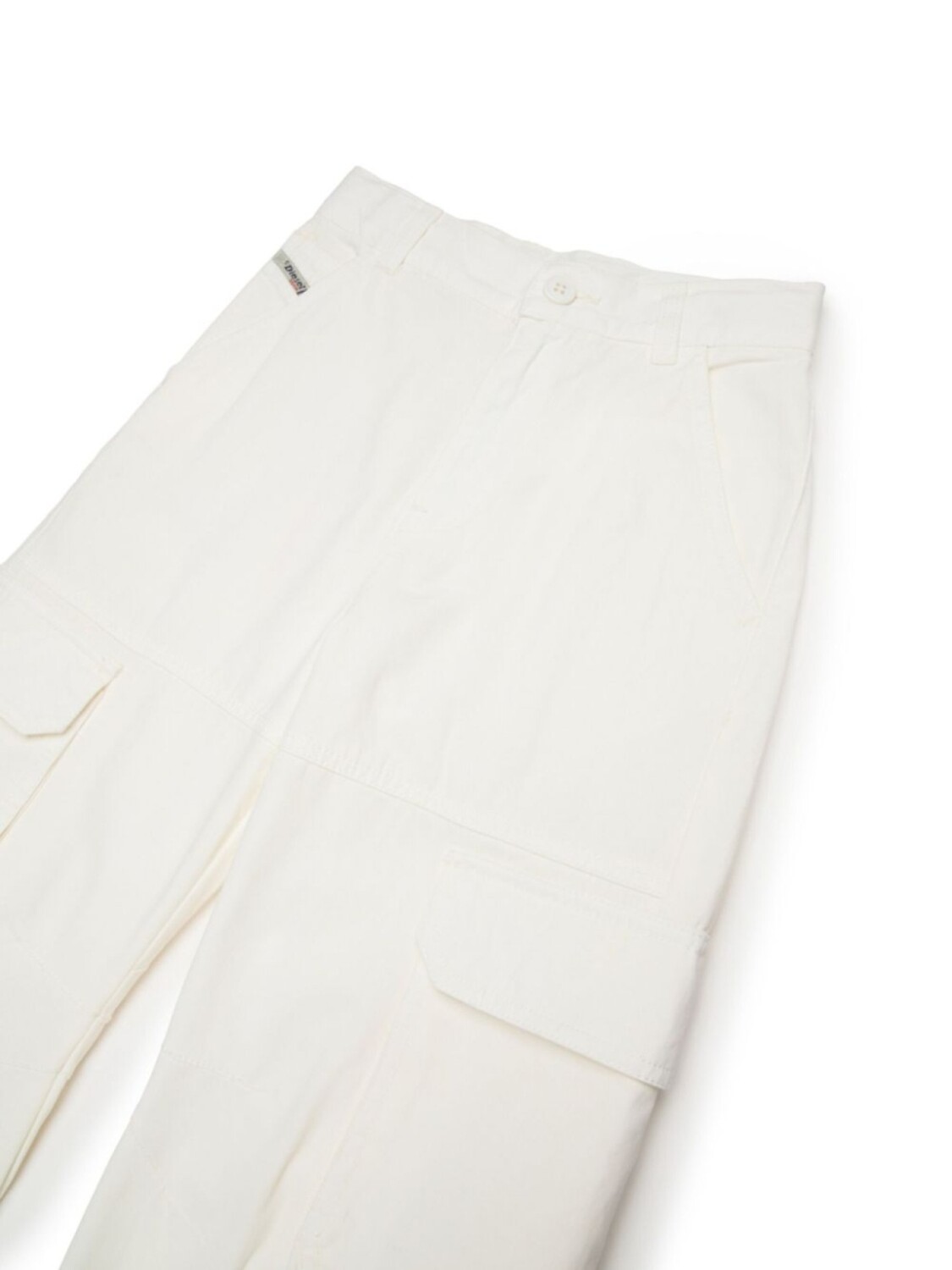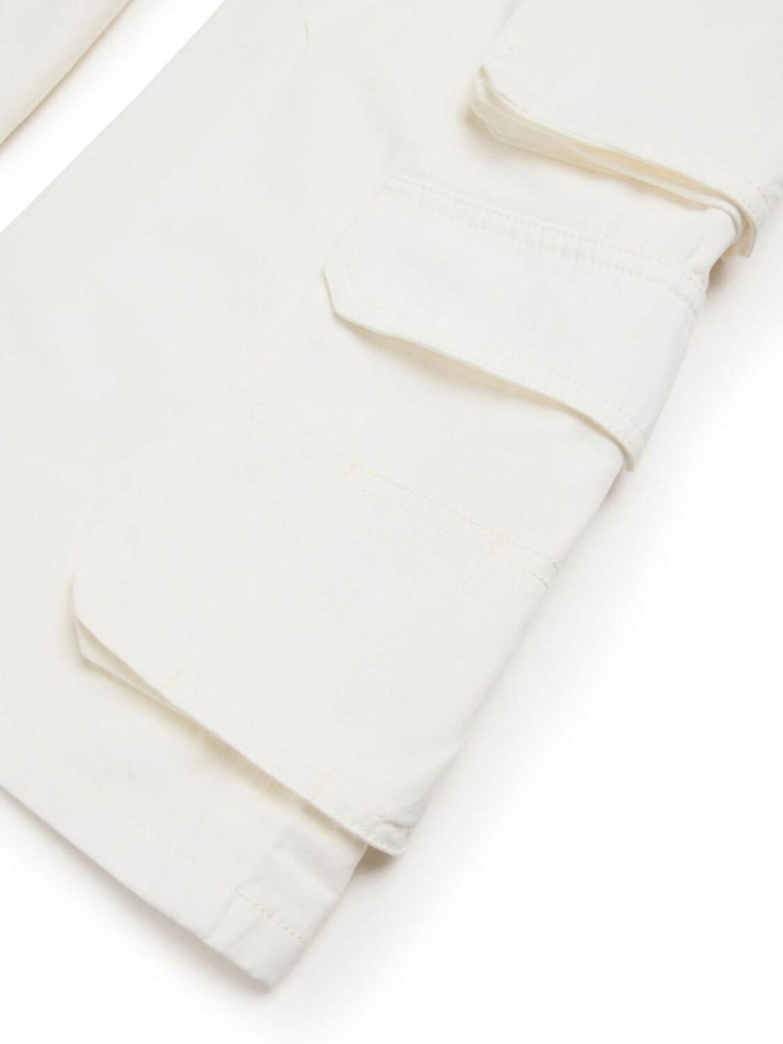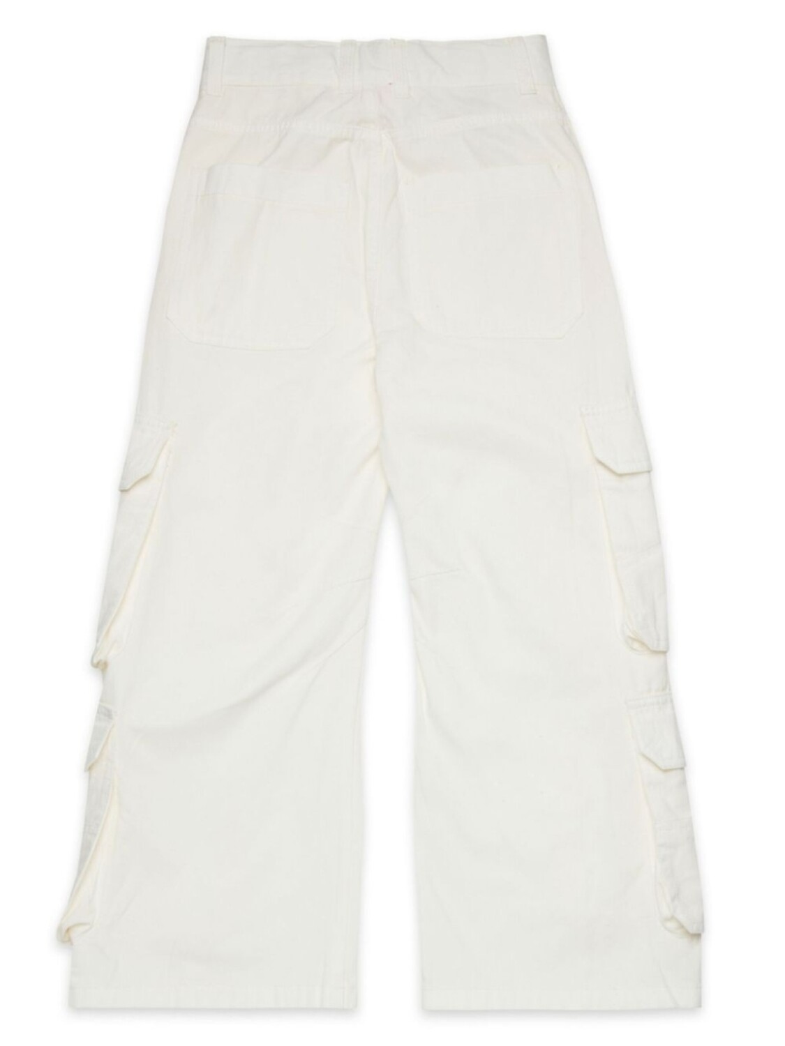 Белый, ширинка на пуговицах, два прорезных кармана по бокам, накладные карманы, два накладных кармана сзади