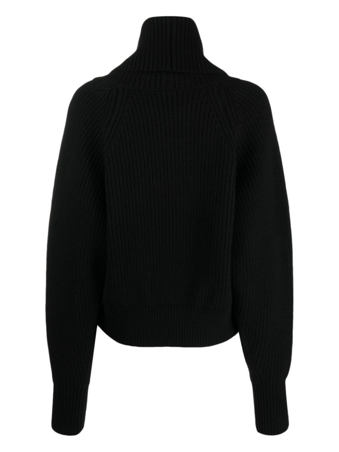 Черный, смесь шерсти и кашемира, трикотаж в рубчик, высокий воротник и длинные рукава.