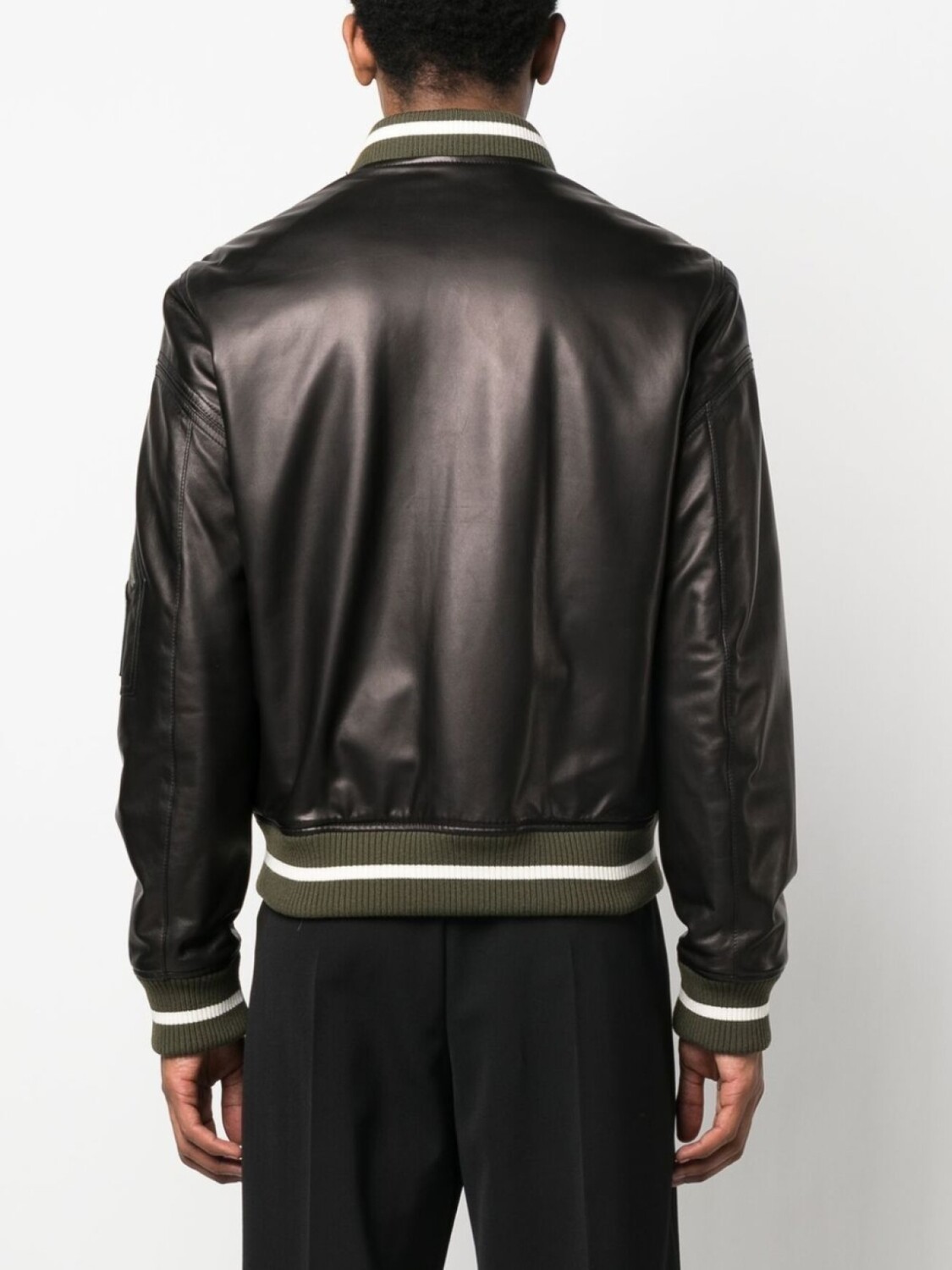 Черный, хаки, белый, телячья кожа, полосатые края, нашивка с логотипом на груди, воротник-стойка в рубчик, застежка на молнии спереди, длинные рукава, карман с молнией на рукаве и два прорезных кармана сбоку.