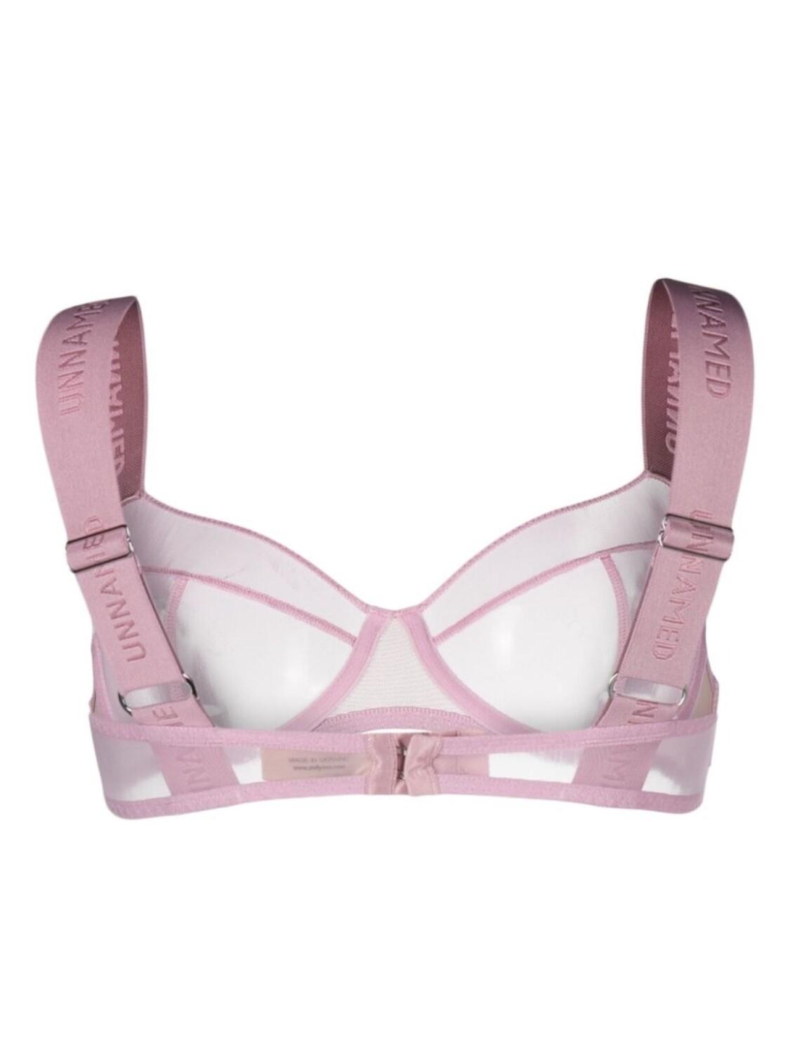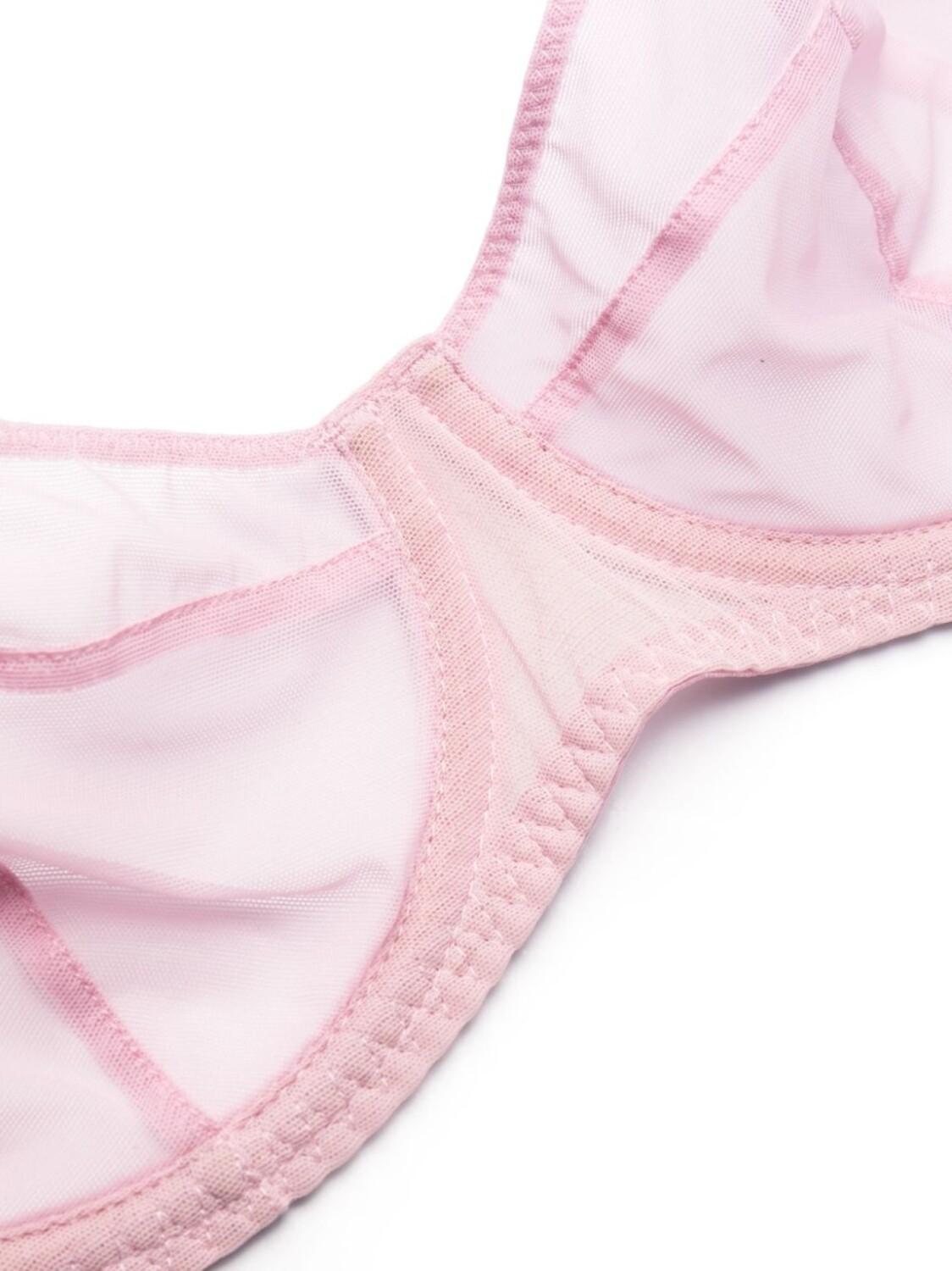 Розовый, сетчатый тюль, полупрозрачный дизайн, балконет, чашка на косточках, ремешки с логотипом, регулируемые лямки и застежка на крючок сзади. Эту вещь можно примерить, но только поверх собственного белья.