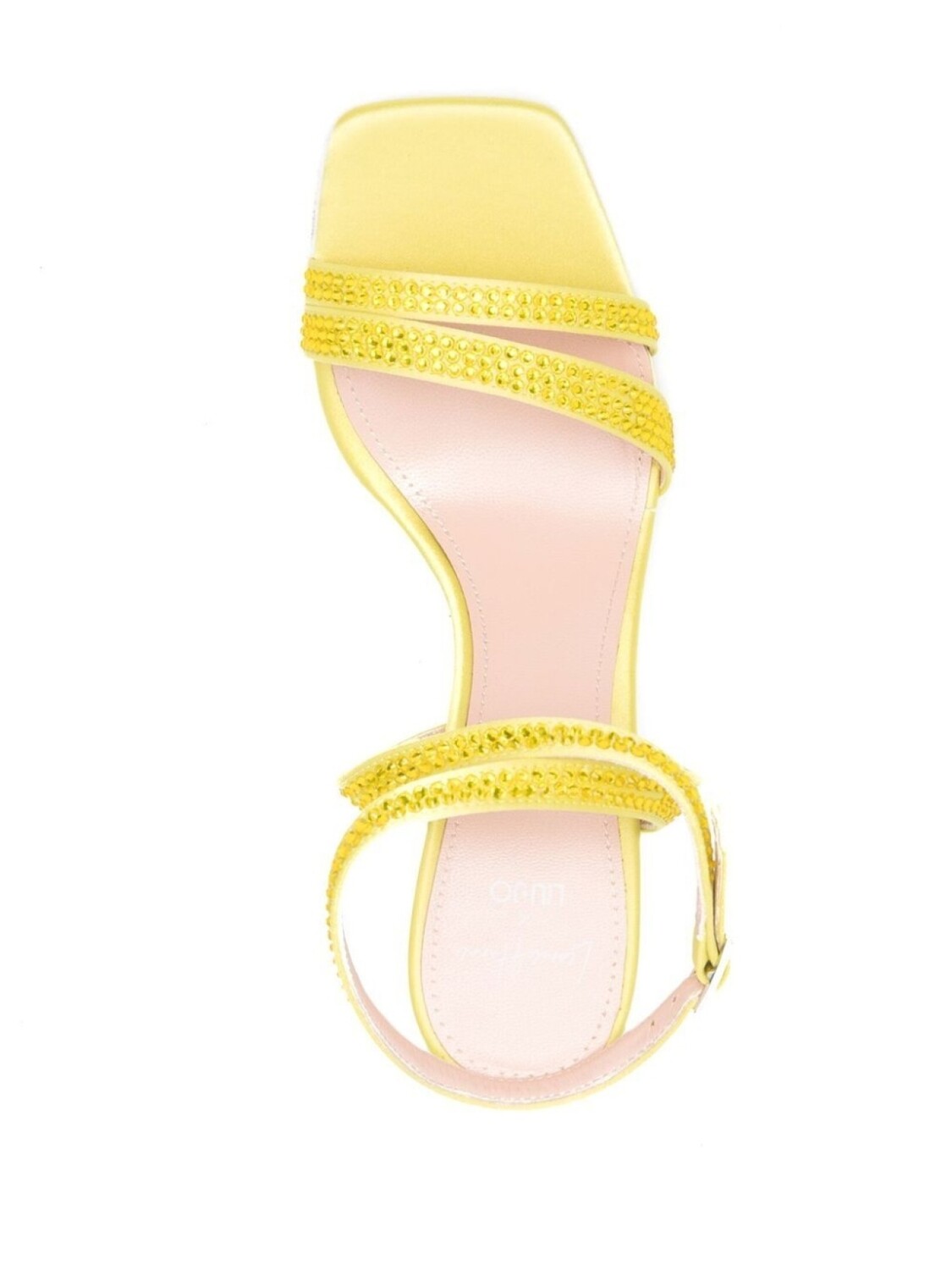 Светло-желтый, кожа, открытый носок, высокий каблук и ремешок на щиколотке с пряжкой.