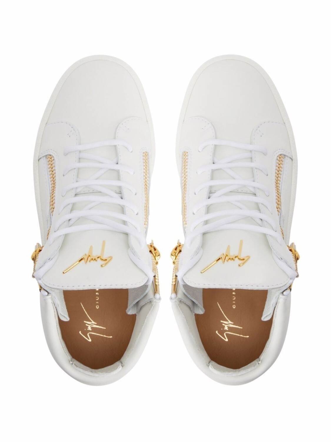 Металлический логотип на язычке, отделка с декоративной молнией, золотистая фурнитура, вырезные детали, закругленный носок, шнуровка спереди, стелька с логотипом и плоская резиновая подошва. Цвет: белый.