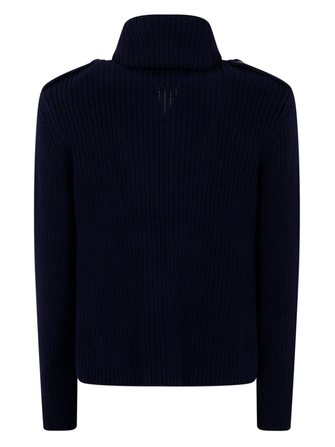 Темно-синий, застежка на пуговицы спереди, два прорезных кармана по бокам, воротник-шалка, длинные рукава