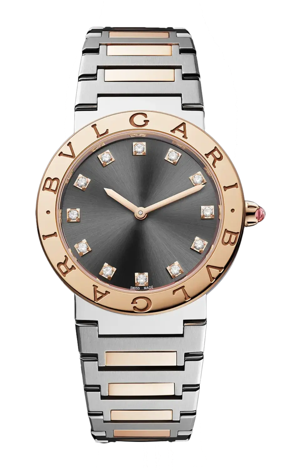 Бренд: Bulgari Часы Bvlgari Bvlgari, символизирующие способность Bvlgari заново изобрести классику прошлого посредством творений с новаторским шармом на протяжении более 40 лет, были первыми, в которых логотип использовался в качестве элемента дизайна. Предвосхищая нынешнюю логоманию, культовый двойной круглый логотип, вдохновленный надписями, выгравированными по краям древних монет, напоминает о римском происхождении дома, создавая идеальный союз традиций и современности, элегантности и повседневного стиля. Женские часы Bvlgari bvlgari, кварцевый механизм, корпус из нержавеющей стали диаметром 33 мм, безель из розового золота 18 карат с логотипом, заводная головка из розового золота 18 карат с розовым камнем огранки кабошон, серый лакированный циферблат, бриллиантовые индексы, браслет из нержавеющей стали и розового золота 18 карат.