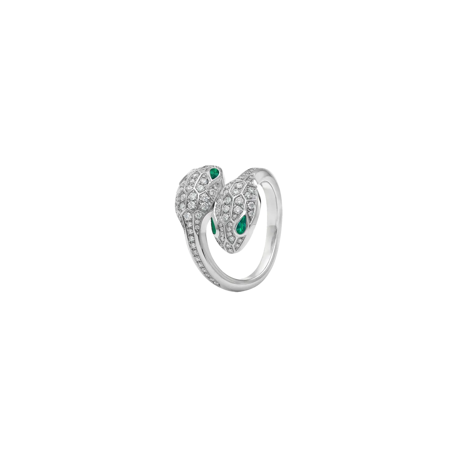 Кольцо «змеи-соблазнители», передающее пленительную красоту змеи и гипнотическую силу ее взгляда, возобновляет очарование легендарного мотива Bvlgari в завораживающем творении с характерным дизайном и неудержимой чувственностью, с драгоценными змеиными головами, украшенными великолепными драгоценными камнями и глаза с неотразимым очарованием. Икона элегантности с опасным шармом Кольцо «Соблазнительные змеи» с двойной головкой из белого золота 18 карат с изумрудами и бриллиантовым паве.