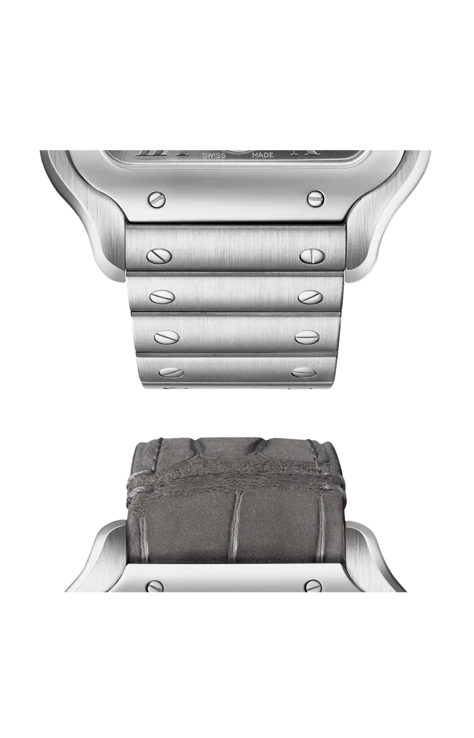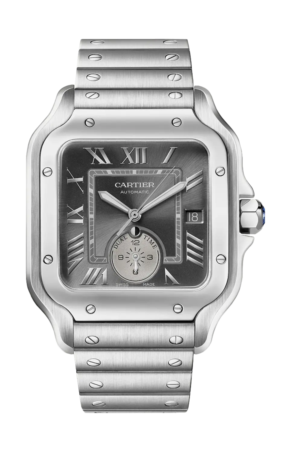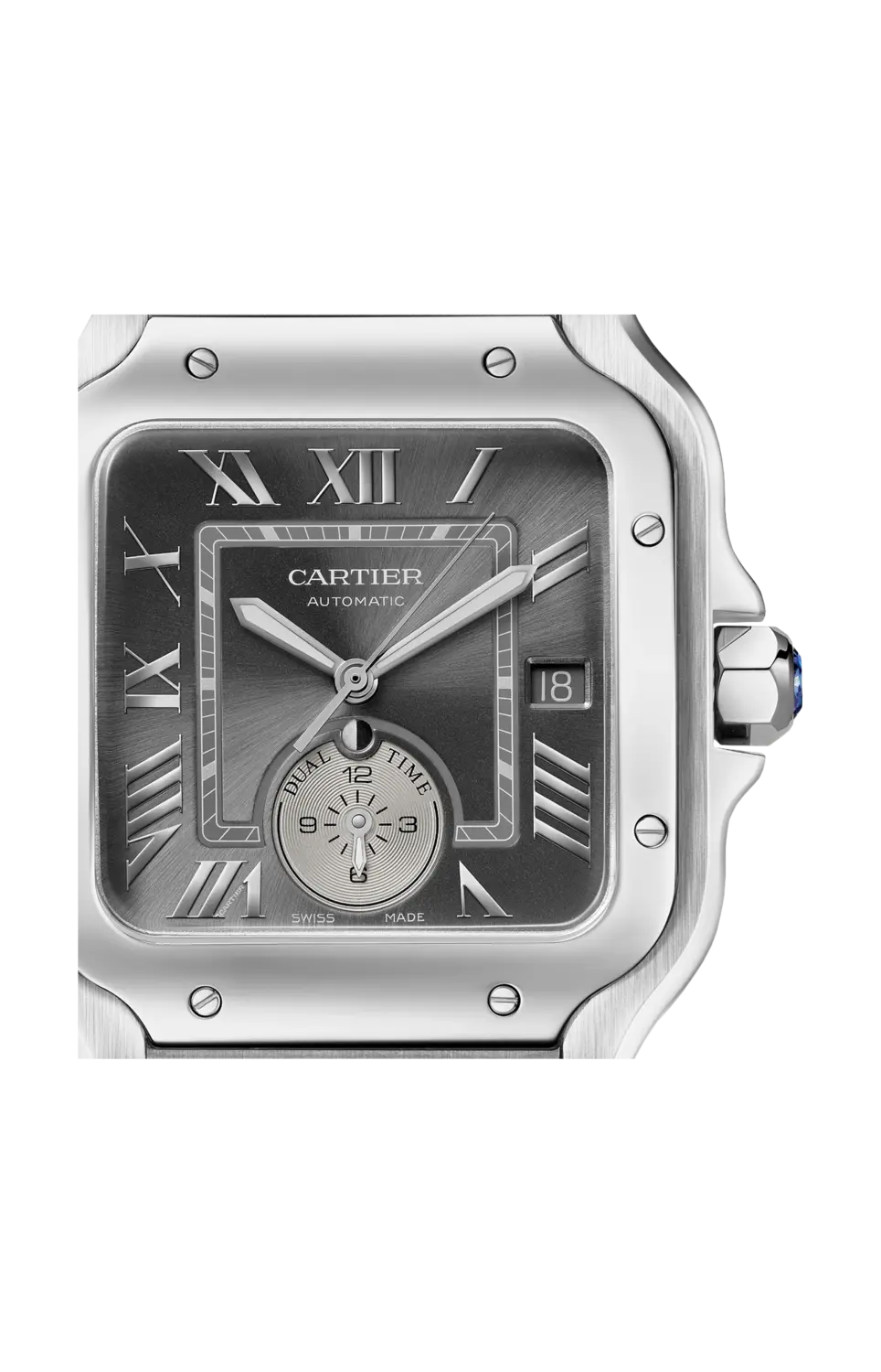 Бренд: Cartier Часы Santos de Cartier с двойным временем, крупная модель, механический механизм, двойной часовой пояс. Стальной корпус, семиугольная заводная головка, украшенная граненой синтетической синей шпинелью, сатинированный антрацитово-серый циферблат с эффектом солнечных лучей, указатель второго часового пояса с дополнительной часовой стрелкой на счетчике и указателем дня и ночи. Стрелки в форме гладиуса из полированной стали с родиевым покрытием и люминесцентного материала, сапфирового стекла. Стальной браслет с системой регулировки размера «smartlink», второй ремешок из кожи аллигатора серого цвета со сменной стальной раскладывающейся застежкой. Браслет и ремешок оснащены системой смены «быстрый переключатель». Ширина корпуса 40,2 мм, толщина 10,01 мм. Водонепроницаемость до 100 метров.