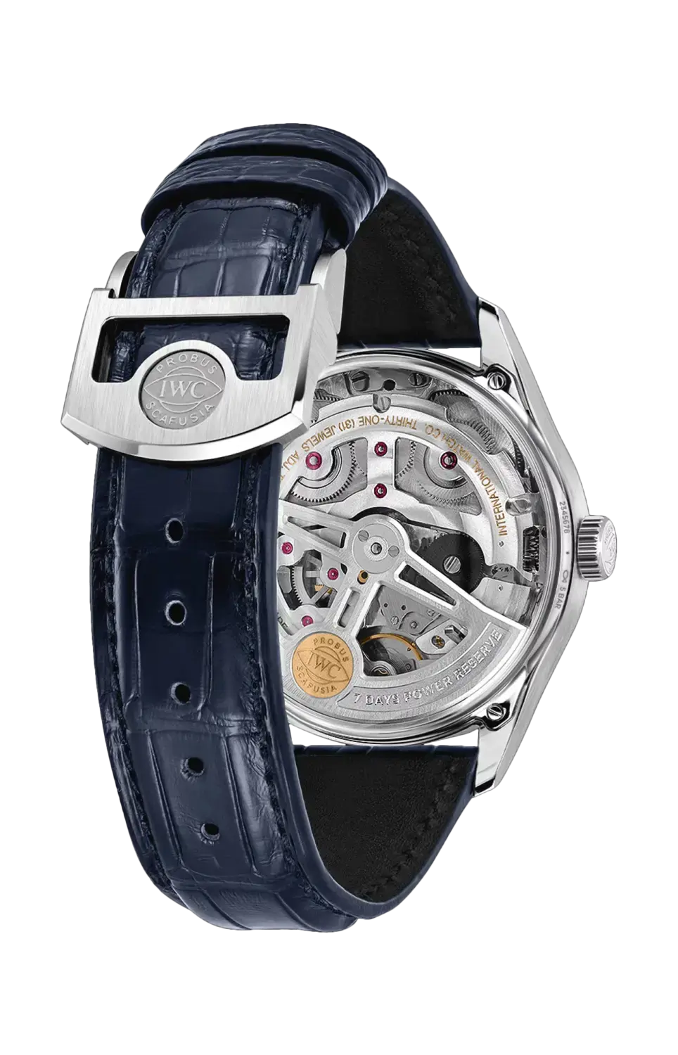 Стальной корпус, автоматический завод, диаметр 42,4 мм, синий ремешок из кожи аллигатора, ширина ремешка 22,0 мм.