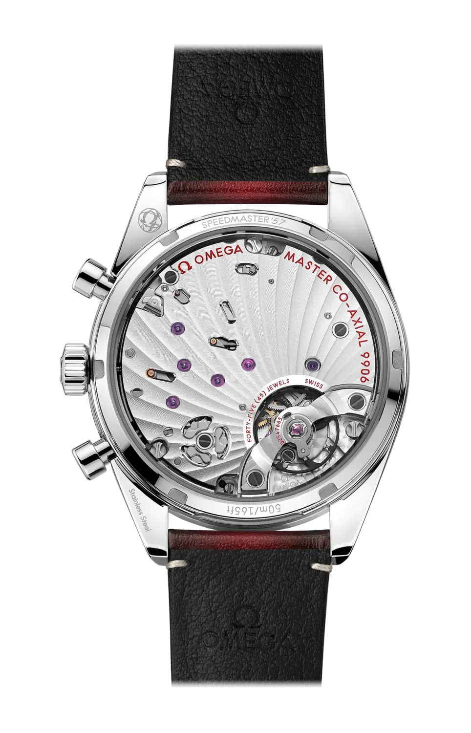 Бренд: Omega Speedmaster — одни из самых знаковых часов Omega. Эти часы, участвовавшие во всех шести лунных миссиях, прекрасно воплощают авантюрный и новаторский дух бренда. Модель диаметром 40,5 мм, вдохновленная легендарной оригинальной моделью 1957 года, имеет корпус из нержавеющей стали и бордовый циферблат с часовыми метками с родиевым покрытием. и стрелки «широкая стрела» с белым суперлюминовым покрытием. Он оснащен окошком даты в положении «6 часов», малым секундным счетчиком в положении «9 часов», а также счетчиками хронографа на 12 часов и 60 минут на дополнительном циферблате в положении «3 часа». Матовый безель украшен полированной тахиметрической шкалой. Плоская задняя крышка из сапфирового стекла с внутренней обработкой и антибликовым покрытием украшена гравировкой «speedmaster '57». Часы сопровождаются бордовым кожаным ремешком с выпуклым логотипом Omega на пряжке. В нем используется коаксиальный хронометр Omega Co-Axial Master Chronometer с ручным заводом, калибр 9906.