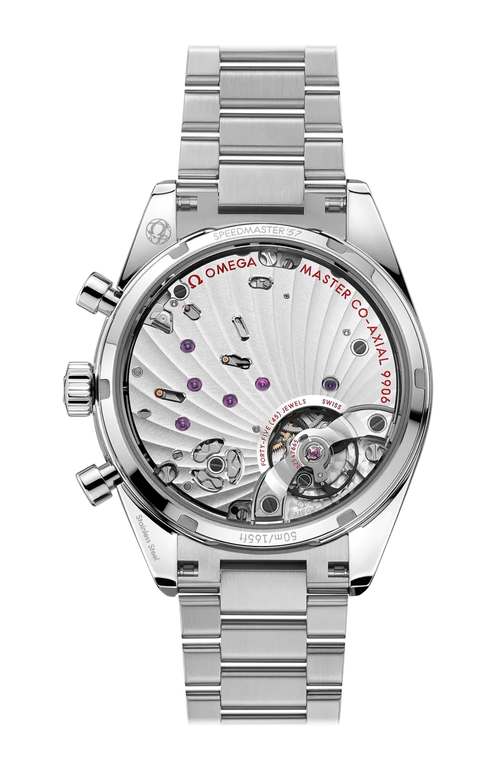 Бренд: Omega Speedmaster — одни из самых знаковых часов Omega. Эти часы, участвовавшие во всех шести лунных миссиях, прекрасно воплощают авантюрный и новаторский дух бренда. Модель диаметром 40,5 мм, вдохновленная легендарной оригинальной моделью 1957 года, имеет корпус из нержавеющей стали и бордовый циферблат с часовыми метками с родиевым покрытием. и стрелки «широкая стрела» с белым суперлюминовым покрытием. Он оснащен окошком даты в положении «6 часов», малым секундным счетчиком в положении «9 часов», а также счетчиками хронографа на 12 часов и 60 минут на дополнительном циферблате в положении «3 часа». Матовый безель украшен полированной тахиметрической шкалой. Плоская задняя крышка из сапфирового стекла с внутренней обработкой и антибликовым покрытием украшена гравировкой «speedmaster '57». Часы сопровождаются соответствующим браслетом, оснащенным удобной запатентованной системой регулировки Omega и анимированы. Omega Co-Axial Master Chronometer, калибр 9906, калибр с ручным заводом.