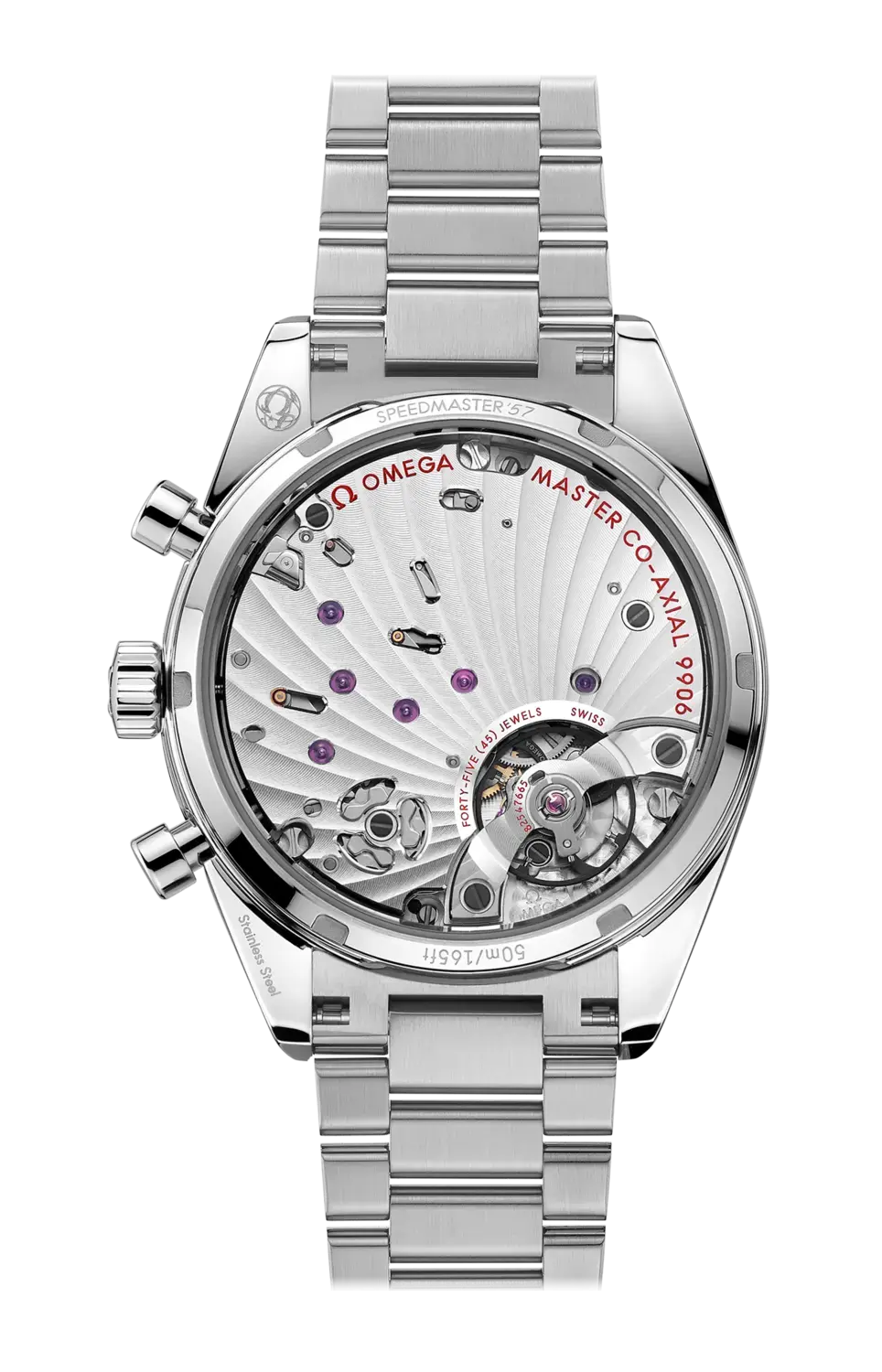 Бренд: Omega Speedmaster — одни из самых знаковых часов Omega. Эти часы, участвовавшие во всех шести лунных миссиях, прекрасно воплощают авантюрный и новаторский дух бренда. Модель диаметром 45,5 мм, вдохновленная легендарной оригинальной моделью 1957 года, имеет корпус из нержавеющей стали и черный циферблат с утопленными часовыми метками с винтажным рисунком. супер-люминова внизу. Помимо родиевых стрелок с широкой стрелкой, она оснащена окошком даты в положении «6 часов», малым секундным счетчиком в положении «9 часов», а также 12-часовым и 60-минутным счетчиками хронографа на дополнительном циферблате в положении «3». Матовый безель украшен полированной шкалой тахометра, а плоская задняя крышка из сапфирового стекла с внутренним антибликовым покрытием украшена гравировкой «speedmaster '57». Часы сопровождаются цифрой. Подходящий браслет оснащен удобной запатентованной системой регулировки Omega и приводится в действие коаксиальным хронометром Omega Co-axis Master Chronometer с ручным заводом, калибром 9906.