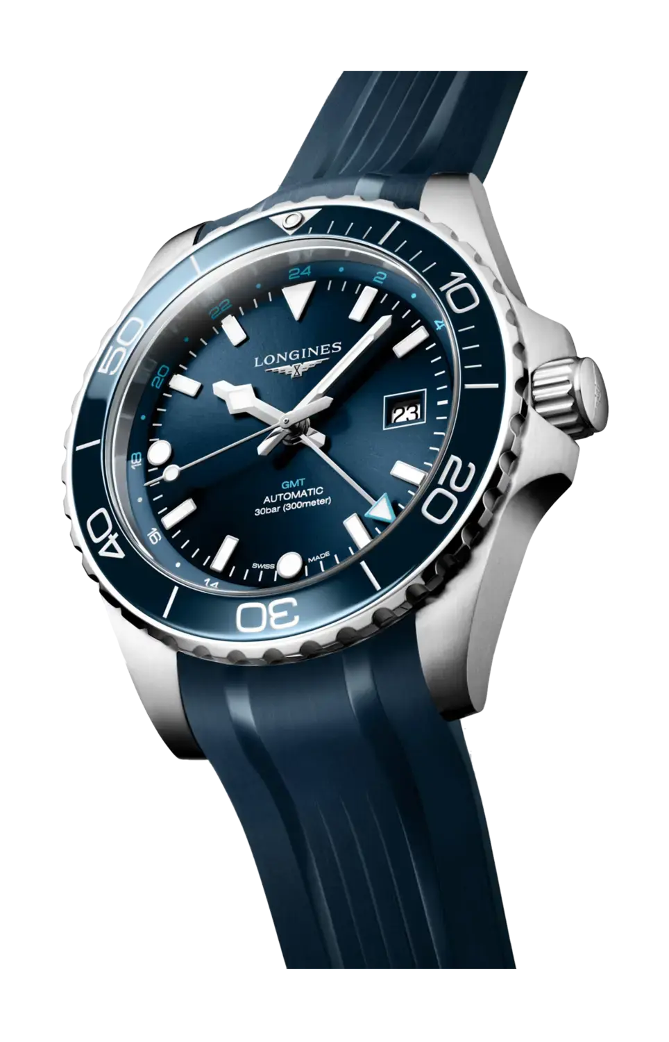 Бренд: Longines Часы Hydroconquest GMT теперь доступны с синим циферблатом диаметром 43 мм и эксклюзивным калибром Longines GMT L844.5. Он отличается высочайшей точностью и запасом хода на 72 часа. Синий циферблат с отделкой в виде солнечных лучей, вращающийся в одном направлении безель из синей керамики, водонепроницаемость до 30 бар (300 метров), завинчивающаяся заводная головка и завинчивающаяся задняя крышка — отличительные особенности этих часов, вдохновленных миром. водных видов спорта. К модели прилагается синий каучуковый ремешок.
