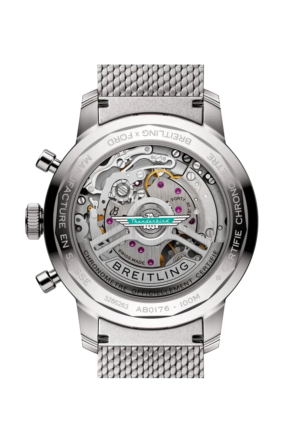 Бренд: Breitling 60-е годы были десятилетием экспериментов, веселья, свободы и энергии. Лозунгом тех дней было жить на максимальной скорости: ездить на мотоцикле в длительные поездки или на борту спортивного автомобиля. Вилли Брейтлинг почувствовал это изменение темпа и решил разработать нетрадиционный хронограф, который бы отражал воодушевление того времени. И он назвал это лучшим временем. Эта наполненная духом традиция продолжается и сегодня: Breitling сотрудничает с некоторыми из самых знаковых мировых брендов автоспорта для создания первоклассных моделей. Ford Thunderbird был впервые представлен в 1954 году на автосалоне в Детройте. Его рекламировали как кабриолет, доставляющий удовольствие от вождения, который выделялся роскошным дизайном, прочной конструкцией и эффектным задним плавником. Top Time B01 Ford Thunderbird имеет цвета и эмблему своего классического автомобильного аналога, а также перфорированный кожаный ремешок в гоночном стиле, тахиметрическую шкалу для измерения скорости и контрастные «белоугольные» счетчики (не совсем квадратные, не совсем круглые), которые имеют напоминают старинные тахометры на приборной панели. Под капотом у этой модели также есть новый двигатель: необычный калибр 01 производства Breitling.