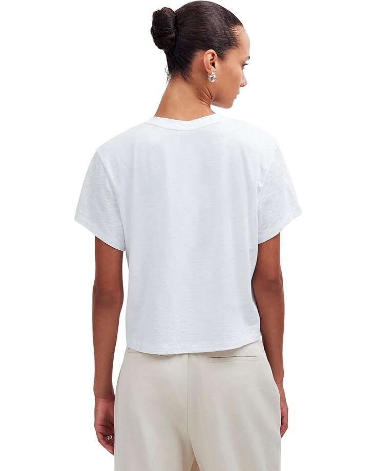 Непринужденный шик на каждый день, футболка Madewell Bella Tee Slub. Эта универсальная футболка имеет классический круглый вырез и короткие рукава, что делает ее идеальной для ношения в качестве слоя или отдельно. Конструкция с застежкой обеспечивает легкость ношения, а текстура с застежкой добавляет нотку визуального интереса. Изготовленная из мягкой, дышащей ткани, она обеспечивает комфорт в течение всего дня и свободную посадку.