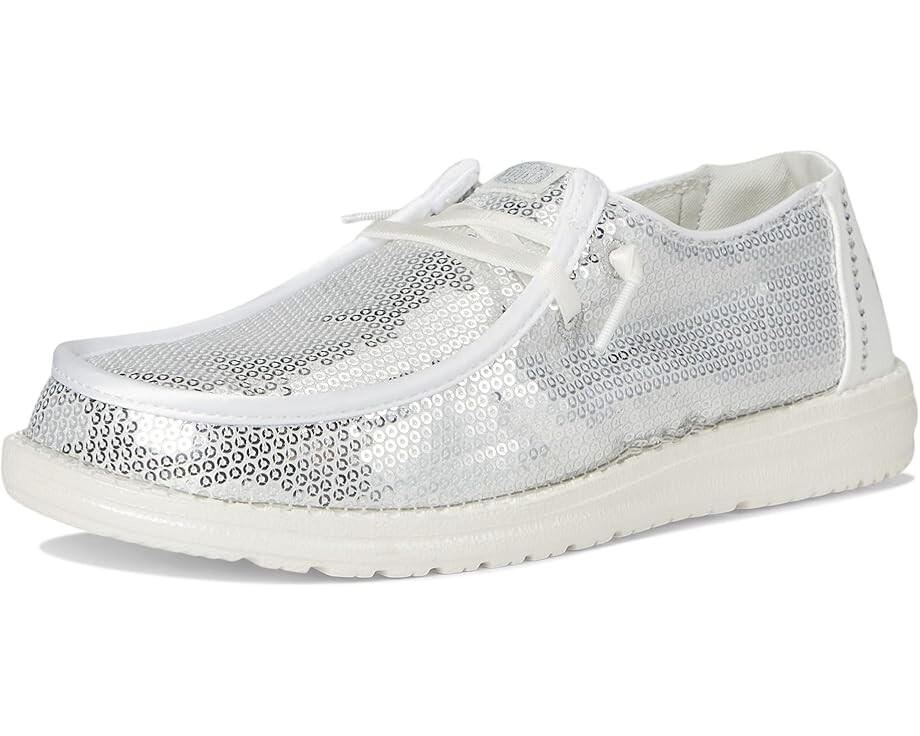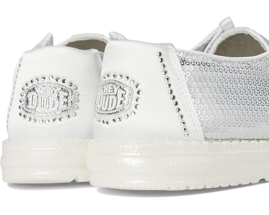 Выйди в центр внимания в кроссовках Hey Dude Wendy Disco Sequin. Изготовленные из парусинового верха, хлопковой подкладки и стельки EVA, эти туфли имеют круглый носок, эластичные кружевные детали, низкий силуэт, сплошную отделку пайетками и стиль надевания.