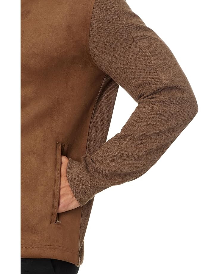 Johnston & Murphy Suede Full Zip — это хлопчатобумажная меланжевая трикотажная куртка с передними панелями из эластичной искусственной замши. Она имеет воротник-стойку с застежкой-молнией спереди, длинные рукава и боковые карманы для рук.