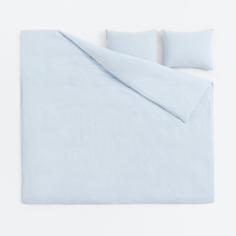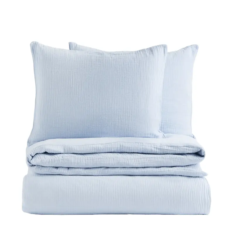 Двуспальное постельное белье из мягкого хлопкового муслина обеспечивает прохладу и комфорт во время сна. Потайные металлические кнопки на кромке. Две наволочки-конверты. Плотность 250 г/м2.