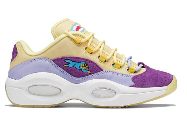 Reebok и бренд уличной одежды Фаррелла Уильямса BBC Ice Cream объединились для выпуска Question Low 'Yellow Lilac Glow'. Эта обувь пастельных тонов является данью уважения дебютным фирменным кроссовкам Аллена Айверсона и отличается верхом из кожи и замши с уникальными элементами брендинга.
