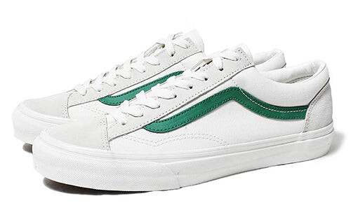 Vans Style 36 'Jolly Green' — классические кроссовки в современном исполнении. Знаменитая боковая полоса обновлена в ярко-зеленом цвете, добавляя яркости чистому белому кожаному верху. Подошва из вулканизированной резины обеспечивает прочность и стиль, а красный логотип на бампере добавляет нотку индивидуальности.