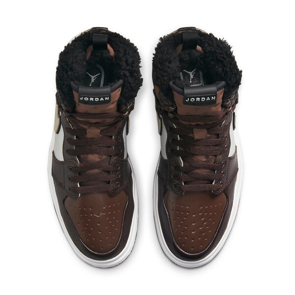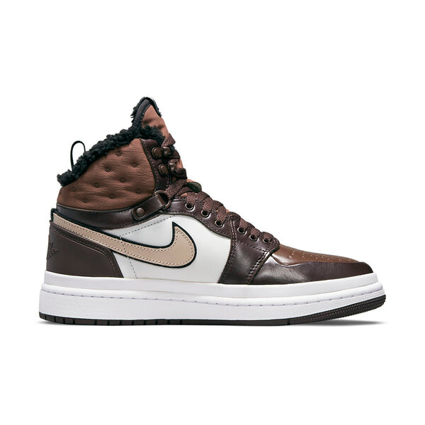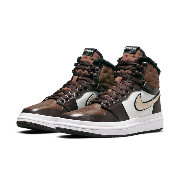 Бренд: Air Jordan Цвет: коричневый Представляем женские кроссовки Nike Air Jordan 1 Acclimate Chocolate! Этот гибрид кроссовок и ботинок идеально подходит для холодных зимних дней. Верх выполнен из коричневой и белой кожи с закругленными краями и прорезиненной накладкой на пятке. Система шнуровки включает в себя крючки для скоростного скольжения и D-образные люверсы. Стеганый текстильный воротник и язычок имеют подкладку из искусственного меха. Над белой резиновой промежуточной подошвой находится соответствующая белая резиновая накладка. Коричневая резиновая подошва с сердечником обеспечивает сцепление и долговечность.