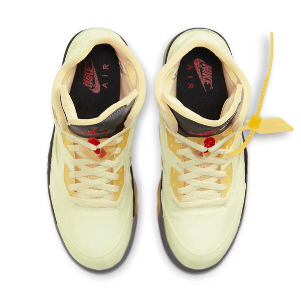 Бренд: Air Jordan Цвет: мультиколор Целая семья — Nike x Off White Air Jordan 5 Retro «Sail» Air Jordan 5 x Off White «Sail» состоит из полупрозрачного материала TPE, покрывающего верх кремового цвета, и круглого полого дизайна на светоотражающем язычке 3M. Он также сохраняет слова, набранные вручную шрифтом Helvetica, слова «SHOELACES» на шнурках и огненно-красные зубцы на межподошве.