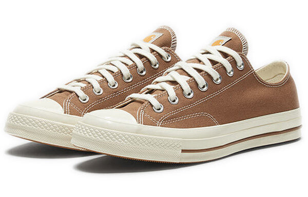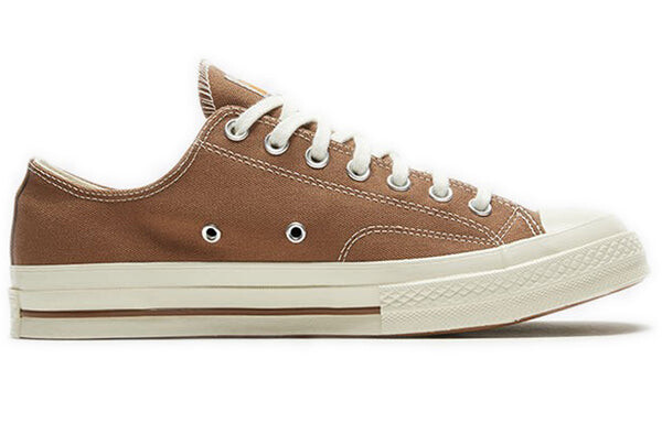 Бренд: Converse Цвет: коричневый Представляем Converse Carhartt WIP x Chuck 70 Low 'Hamilton Brown' — утилитарный взгляд на культовые низкие кеды. Эти кеды разработаны в сотрудничестве с брендом рабочей одежды Carhartt WIP и изготовлены из органического холста плотностью 12 унций в простом оттенке коричневого цвета. Они имеют контрастную белую строчку и блестящие хромированные люверсы, а тканый ярлык Carhartt украшает язычок. Резиновая подошва цвета Off-White имеет тисненый номерной знак Converse вдоль пятки.